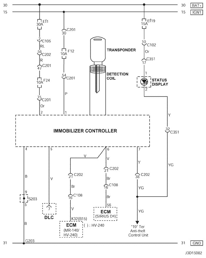 При включении переключателя зажигания, ключ проверяется противоугонной системой иммобилизатора. При считывании кода ключа блоком управления иммобилизатора или комплексным встроенным блоком управления противоугонного устройства, двигатель может запуститься любым ключом, который поворачивает блокировочный цилиндр. Код ключа считывается и сравнивается с кодами ключей, сохраненными в памяти блока управления иммобилизатором. При определении действительного ключа, блок управления иммобилизатором посылает сообщение с последовательно передаваемыми данными в блок ЭСУД. В исходящее сообщение включается код идентификации для подтверждения, что ни блок управления иммобилизатором, ни блок ЭСУД не были заменены для обхода системы. При получении недействительного сообщения контроллер ЭСУД выполняет следующие действия: