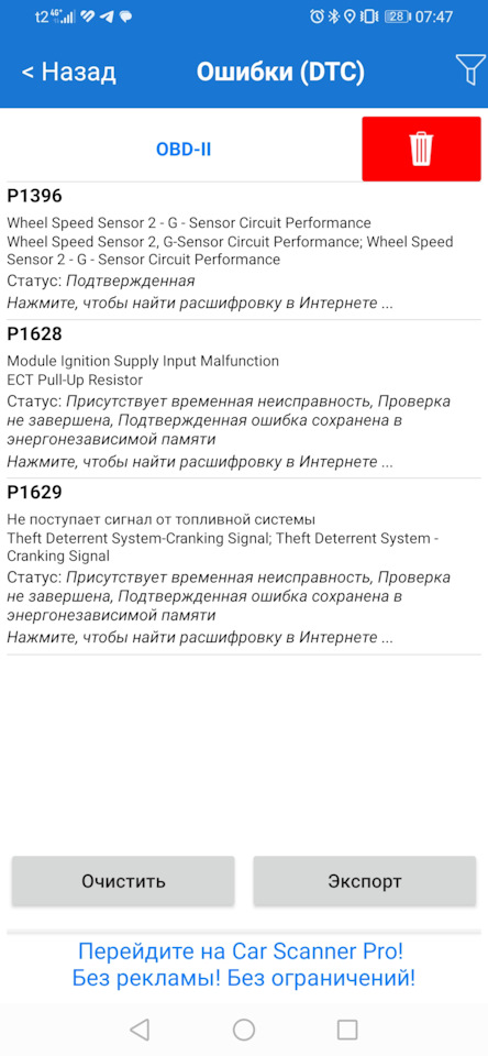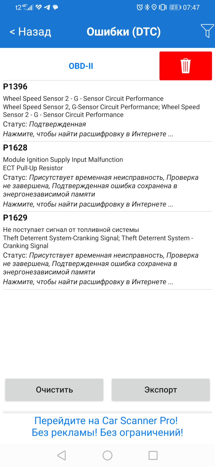 Доехал до работы, вытащил ключ, а машина как работала так и работает. Но у меня такое уже было 4е года назад, поэтому сильно не удивился. Открыл водительскую дверь, она тут же заглохла. Закрыл, на приборке в полнакала половина лампочек горит и красным индикатор на водительской двери. Пришлось клемму акума скинуть чтоб не разряжалась. Вечером завелась нормально. Но появилась ошибка по абс. Считал ошибки а там как раз кроме p1396, висят р1628 и р1629.