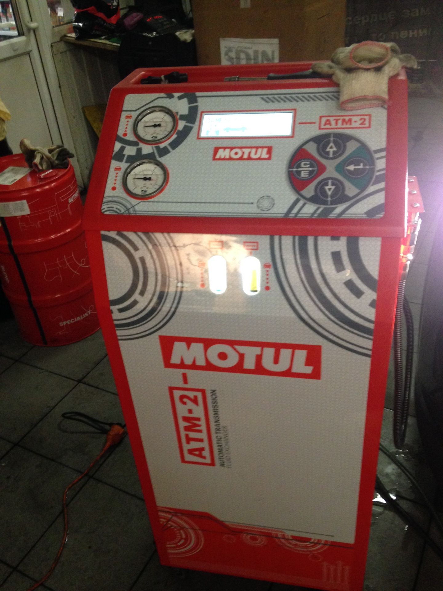 Замена масла производится на новом аппарате от MOTUL. Ничего там сложного нет — внизу сзади две канистры — старое и новое масло, трубки визуального контроля магистралей со старым/новым маслом и датчики температуры, объема прокаченного масла.