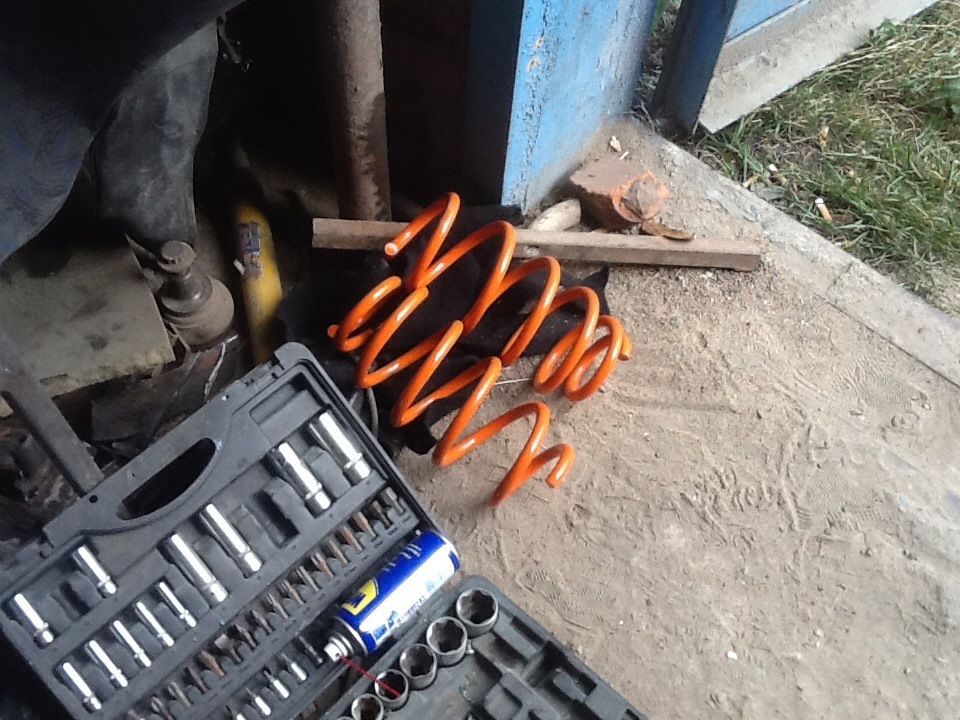 Много писать не буду про процедуру замены пружин, всем надеюсь известно как это происходит. Единственное что нас притормозило, отсутствие коротких стяжек для пружин, пришлось газануть до магазина. А в остальном все отлично, все гайки и болты открутились легко и просто. Ну и собсна результат: