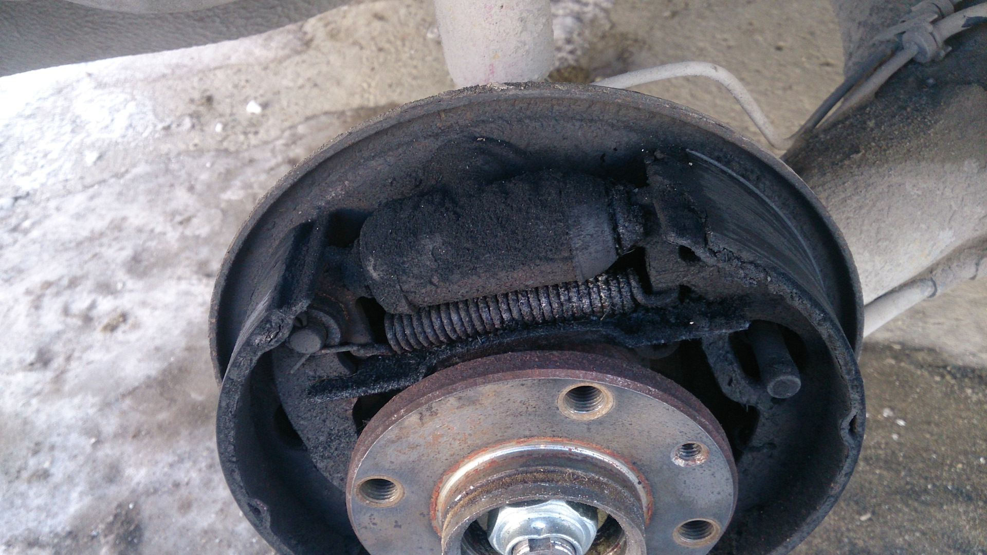 Решил залезть в барабаны, глянуть состояние колодок, да и пружинку на тросе подрезать.