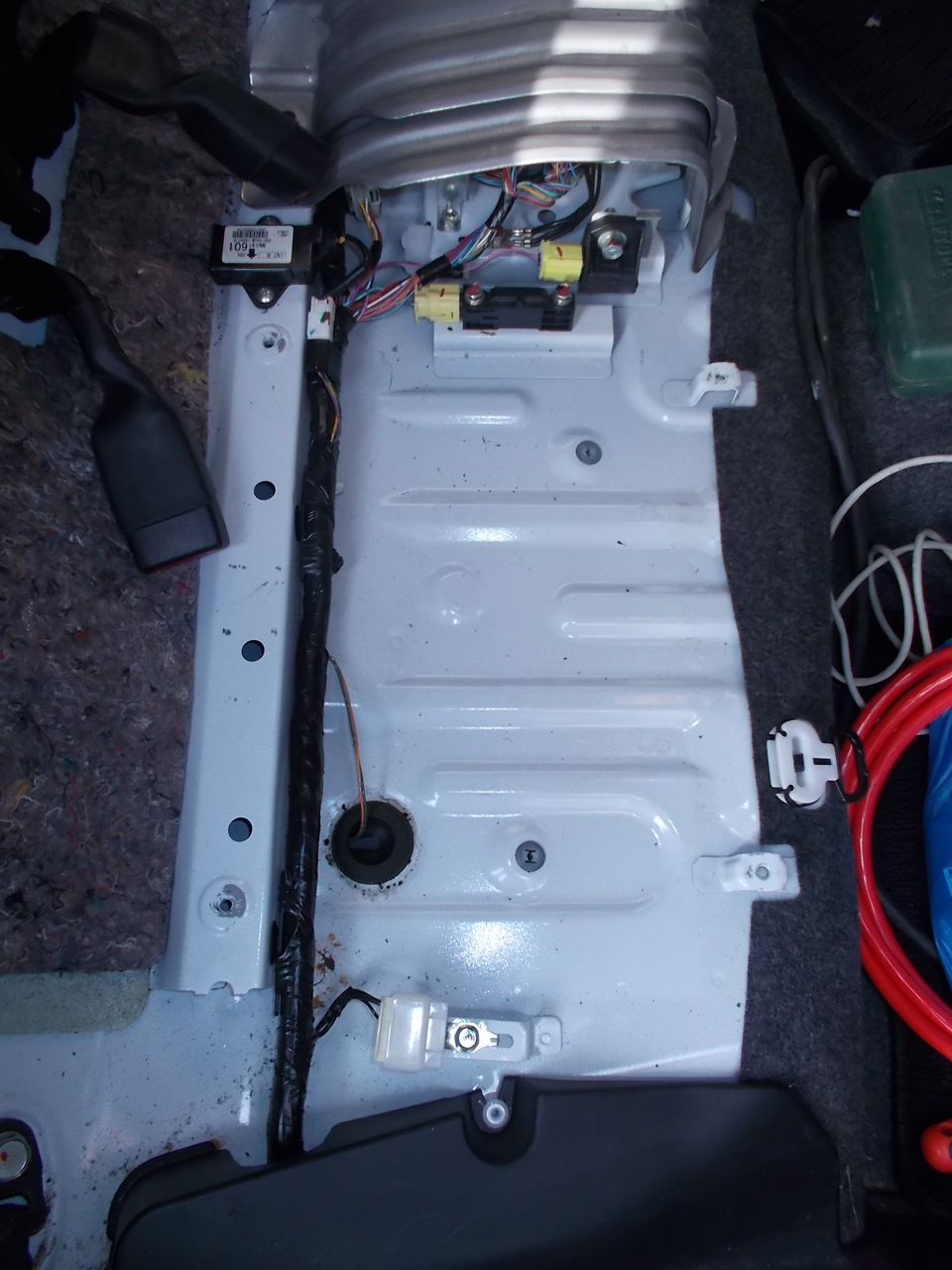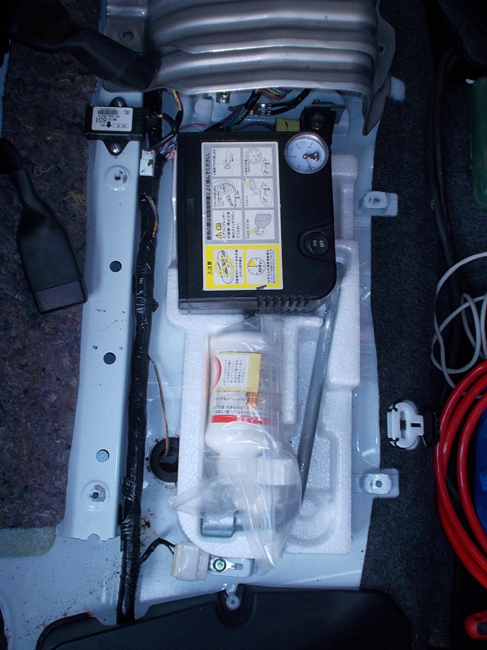 Я с уважением отношусь к японским инженерам, но крайне отрицательно отношусь к идее запихать домкрат в одну нишу, а крючок, балоник с ремкомплектом и компрессором в другую, причем находящуюся под задним сидением, которую еще и надо открыть при помощи монеты, а лучше отвертки (которой как правило под рукой в машине нет).