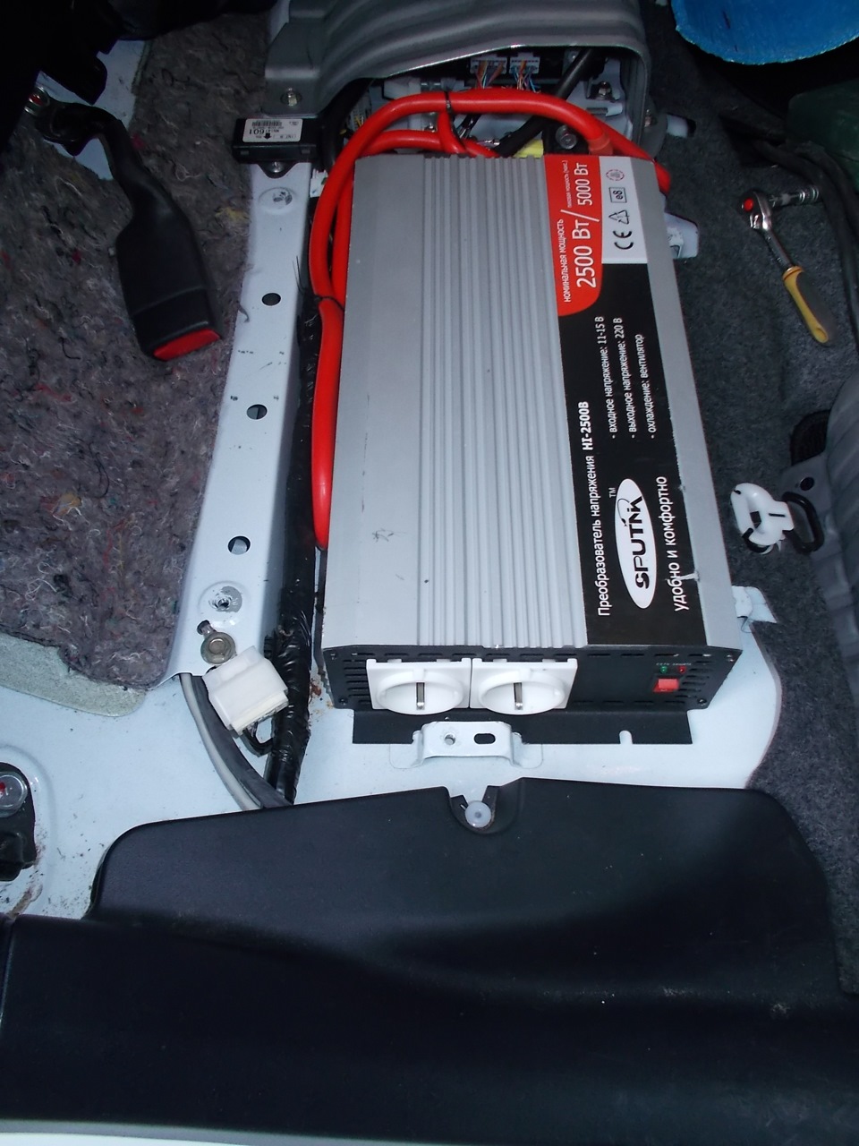 Управление и визуальный контроль выводим на панель на месте заглушки возле отопителя салона. Там же ставим пылевлагозащищенную (ПВЗ) розетку. Вторую ПВЗ розетку непосредственно от преобразователя ставим в багажник.