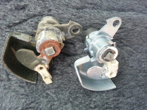 Снял обшивку и минут за 10 поменял личинку, даже не стал фоткать, там все элементарно, откручиваем один болт на 10'' и снимаем тягу, все, личинка у нас в руках, ставим новую. Старая и новая личинки: