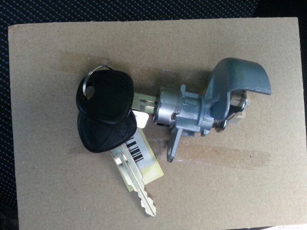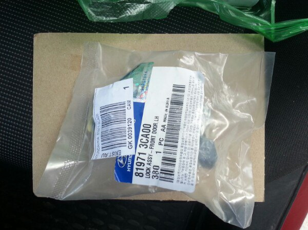 Машину я открыл. Первым делом требовалось что-то придумать с личинкой двери, так как машина стояла открытой. Заказал личинку, она идет с двумя ключами. Номер: Hyundai/Kia 81971-3CA00 Личинка с ключами замка двери Цена 1.050 руб. (середина апреля 2017).