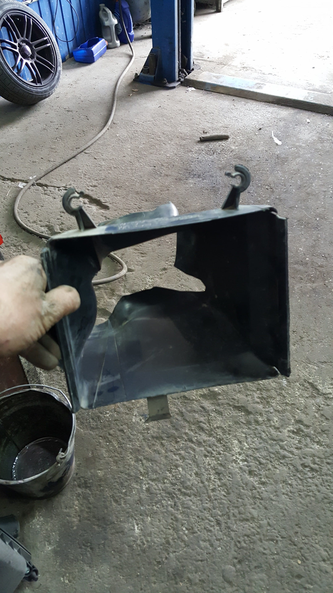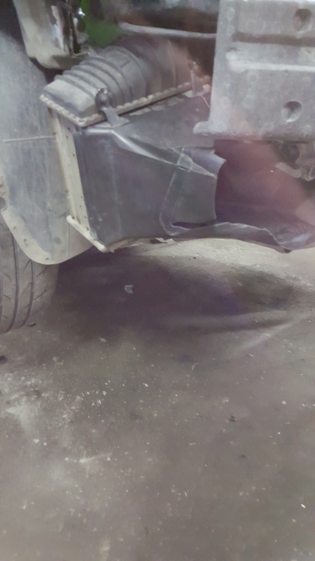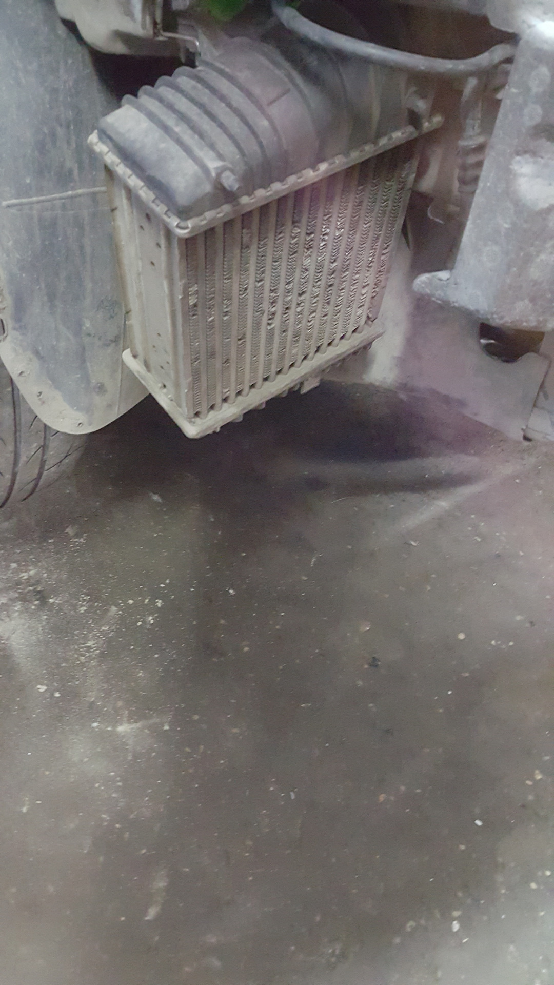 добрый времени суток . всем читателям . гостям . с момента замены турбика заметил что впуск начел сильнее греться и думал что можно придумать с этим пока времени пока не поставлю фронтальник и после работы занюгнал в гараж на падёмник и начел думать что можно придумать и там я заметил ушки торчаши с кулера и понял что чего-то не хватает и позвонил другу и окозалось что у него есть на кулер фляней он мне подогнал и я поставил заметно впуск начил лучшие оставаться. и было решено снять птф так как они тоже мешали обдуву