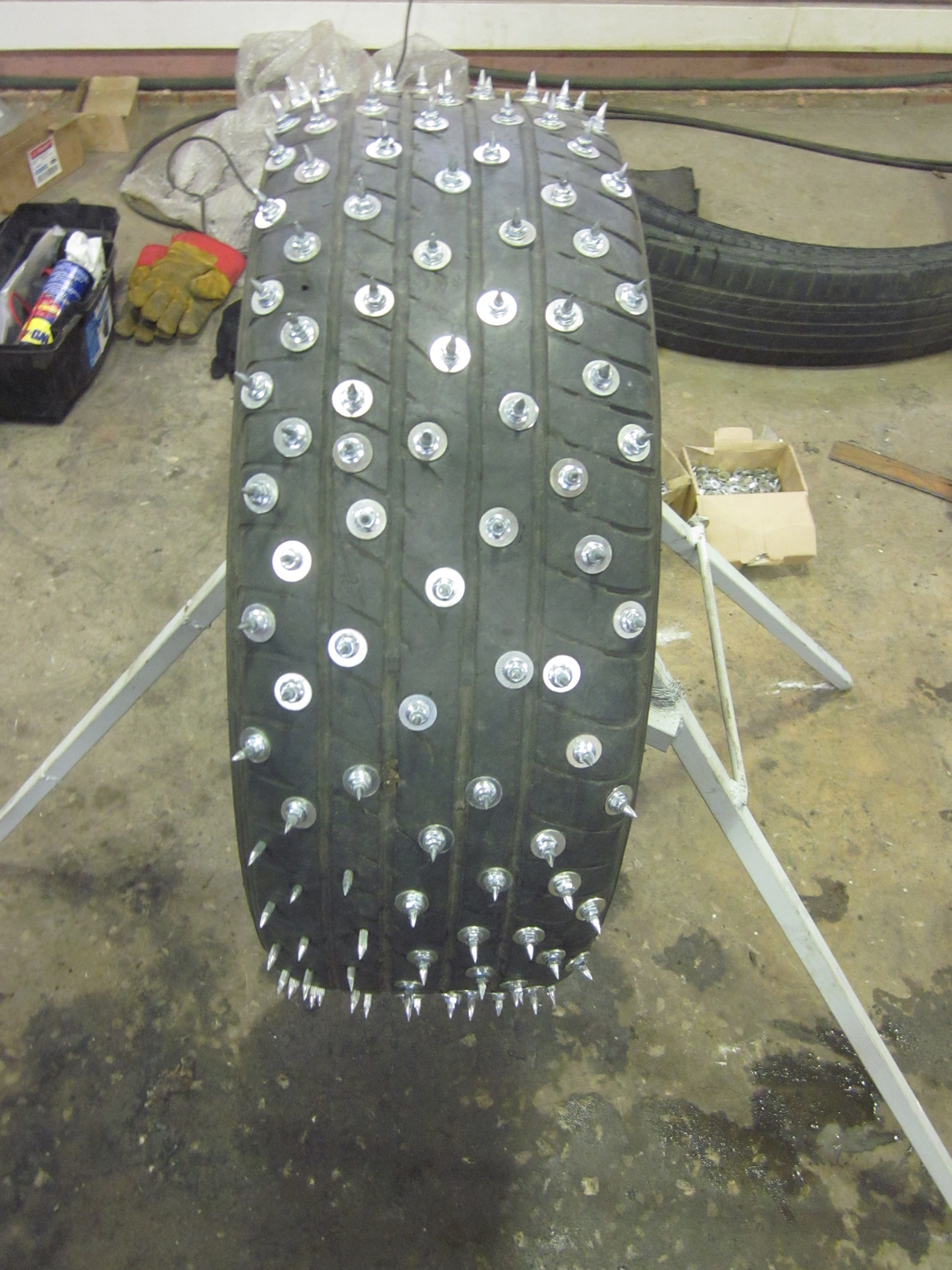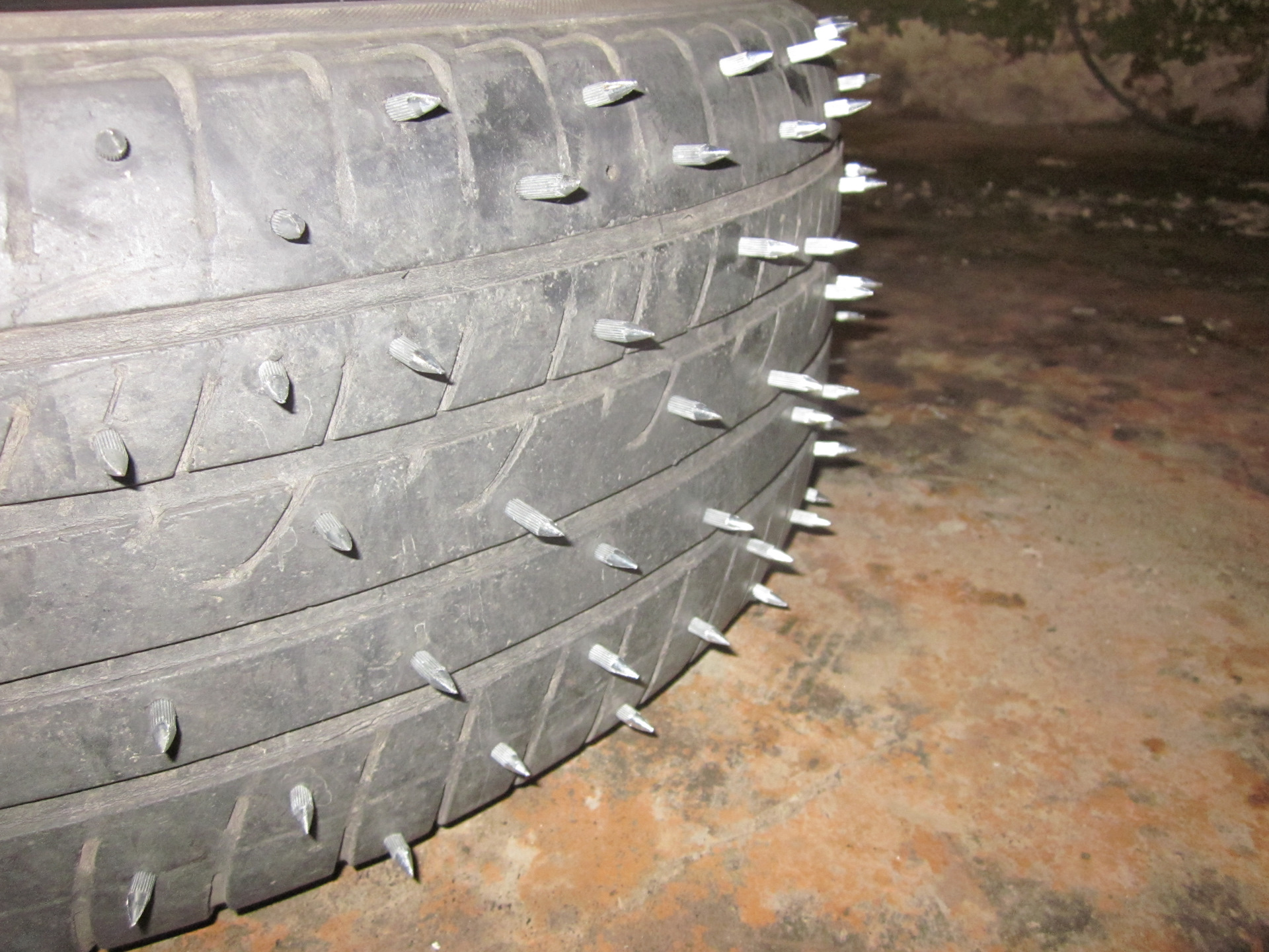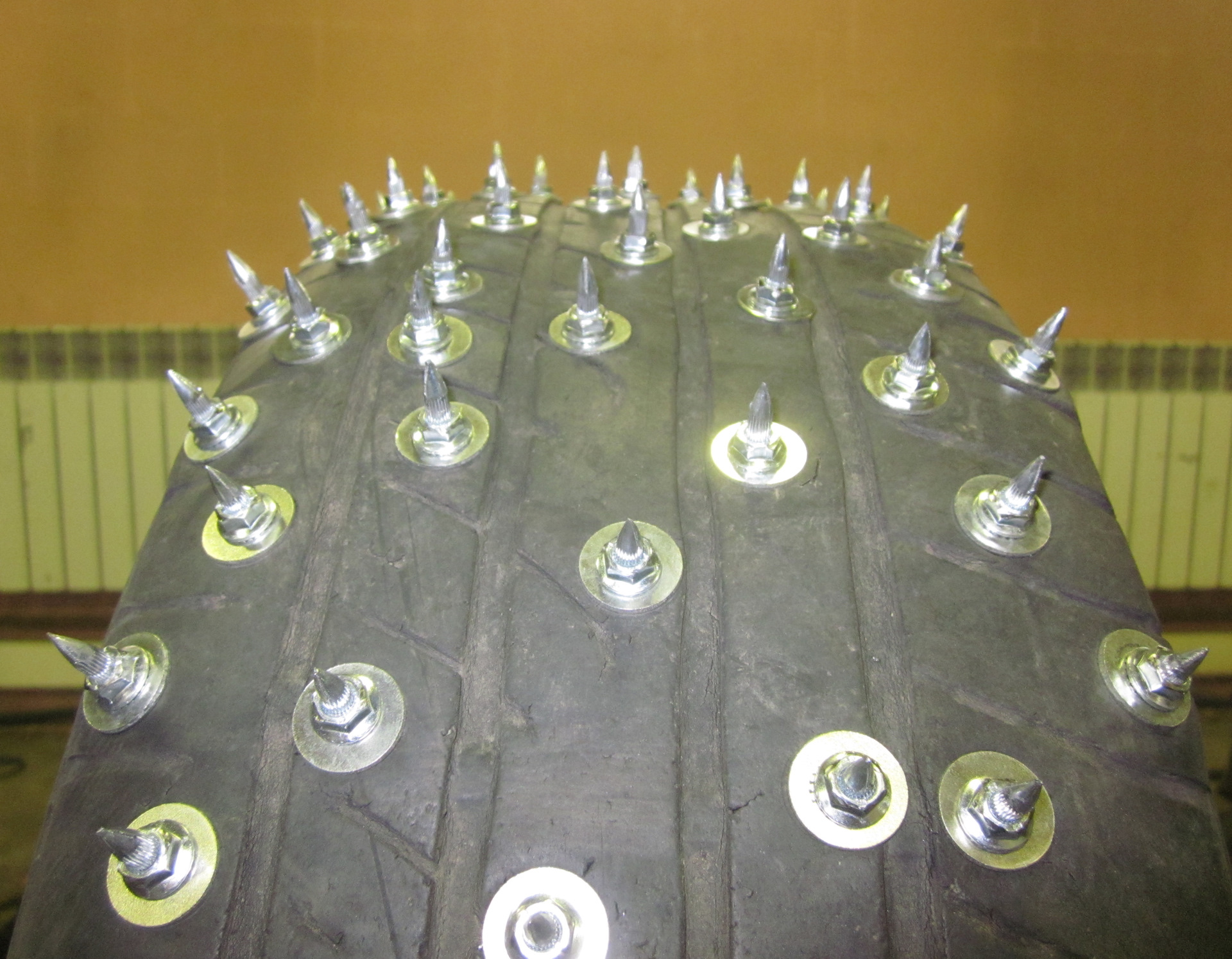 Количество шипов: примерно по 230 дюбелей в каждом колесе. Можно и больше, но не факт, что нужно.