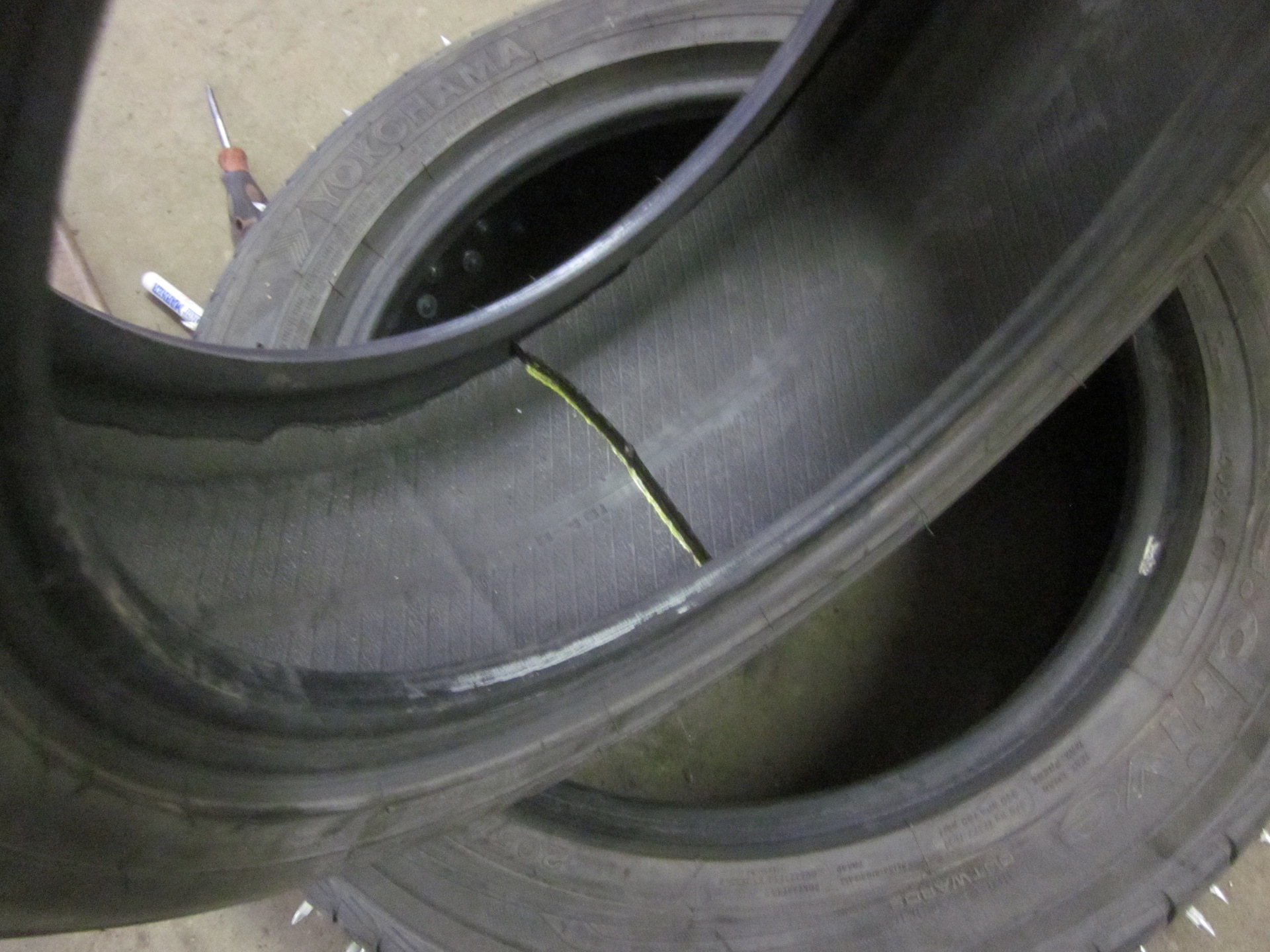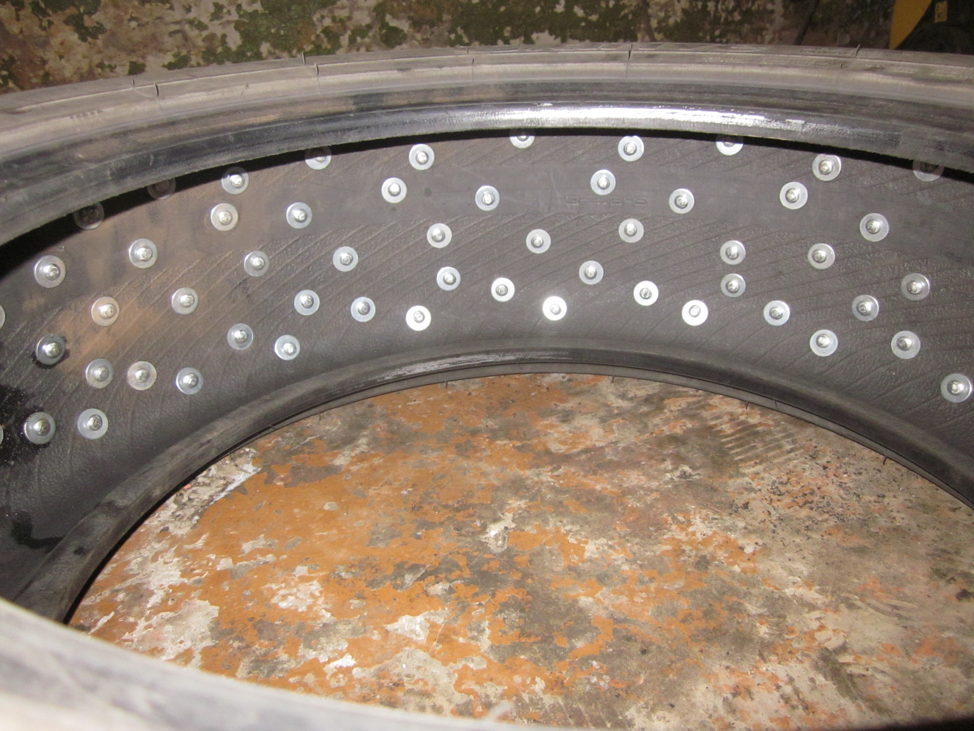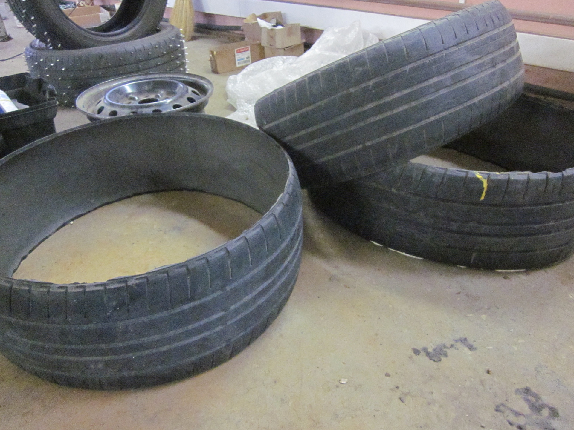 5) В качестве подложки-еще один комплект лысой летней резины R16, от которого были отрезаны боковины и оставлена только беговая часть. Можно использовать что-то типа конвейерной ленты, из плюсов-меньше вес, из минусов-стоимость. Варианты типа линолеума, резины от камер-не надежно, протрется.