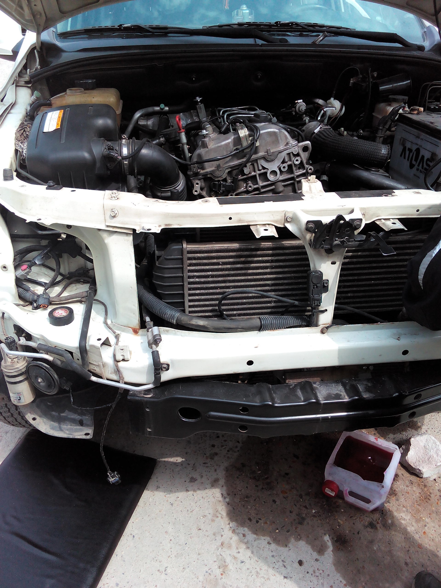 Далее всё проще, отвёз радиатор мастерам, где мне вполне удачно заглушили 2 соты. Привёз обратно и пошла довольная сборка. Пока радиатора не было всё ещё раз перепроверили и подтянули. И вот всё собрано. Довольные заливаем антифриз и заводим машину. Здорово да? а хрен там! Вы что забыли кто я сегодня? Праааальна — рукожоп. Я ж трубку подачи с АКПП не затянул. Прощай 1-1,5 литра масла из коробки ))))