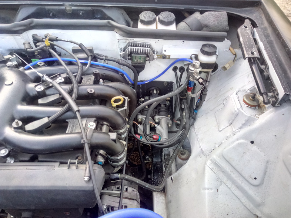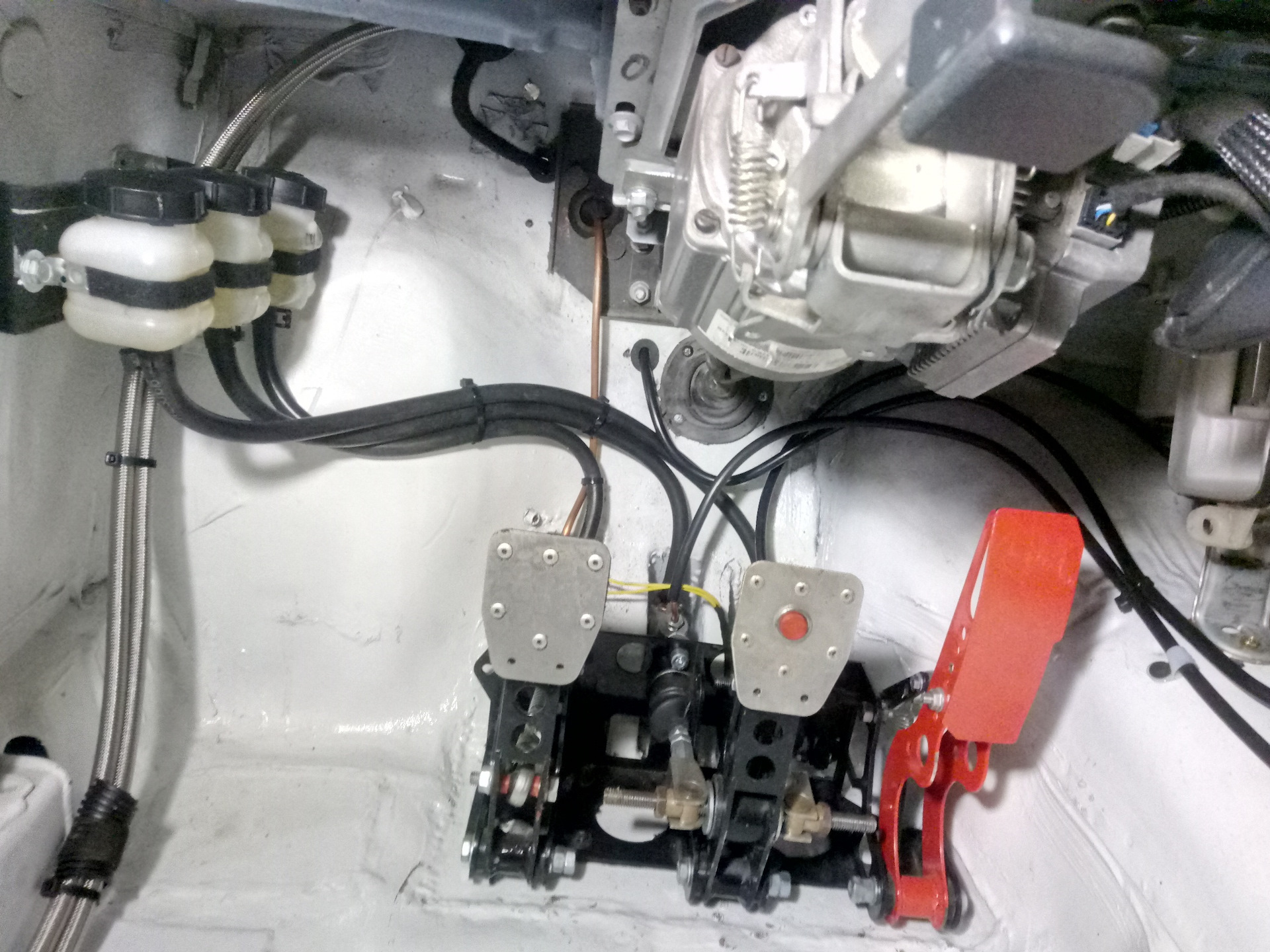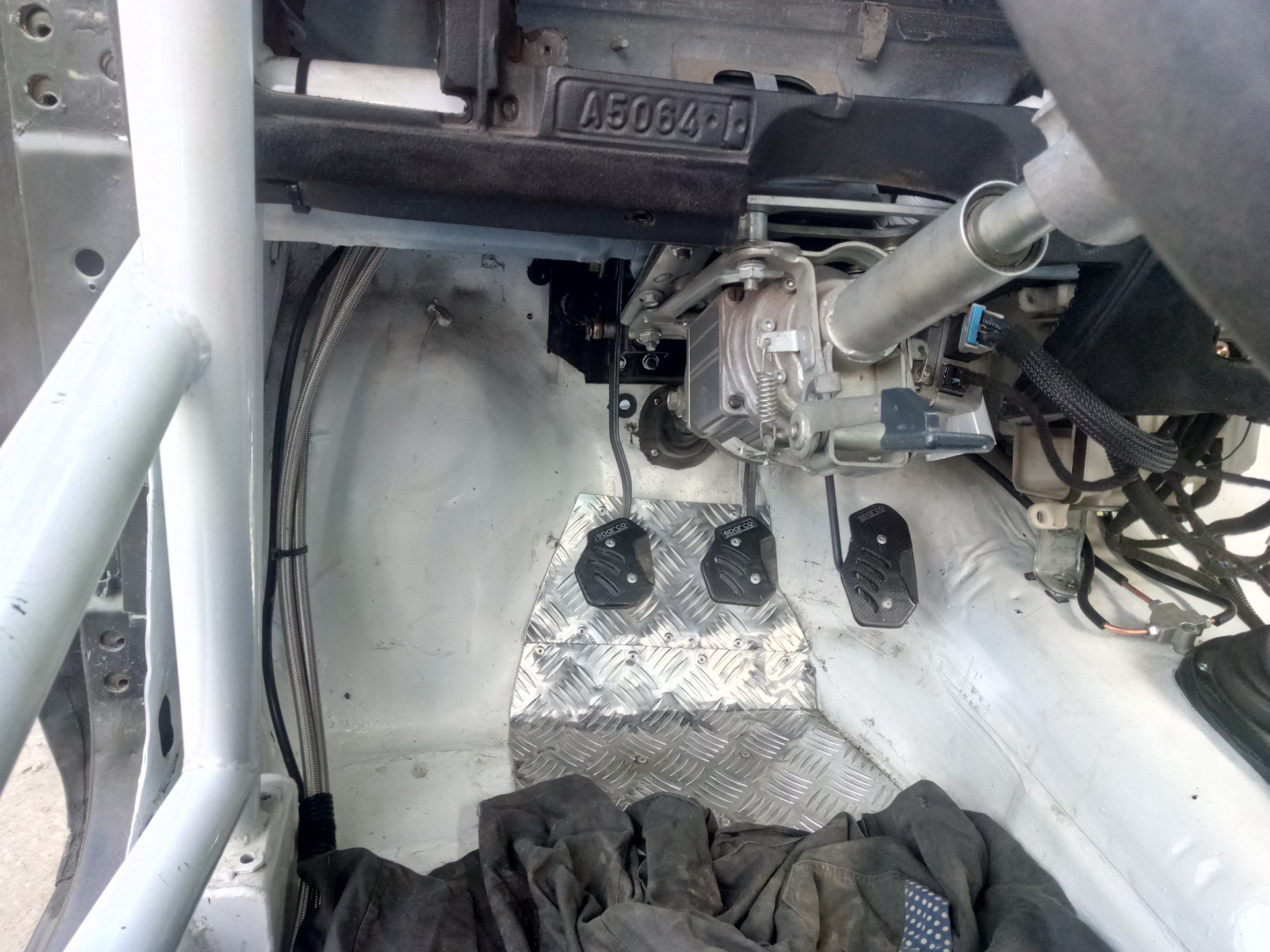 Если раньше, с левой стороны под капотом, было много места, то теперь все наоборот, а еще там надо будет прижиться патрону системы пожаротушения. Пришлось немного переделать тормозные трубки и завести в салон сверху педального узла, а заднюю пустить по левому порогу и далее под водительским сидением. Напомню, что левые и правые трубки сделаны одной длины. Ну вроде все распихали, прокачали, накладки на педали приклепали- все круто. Все работает)))