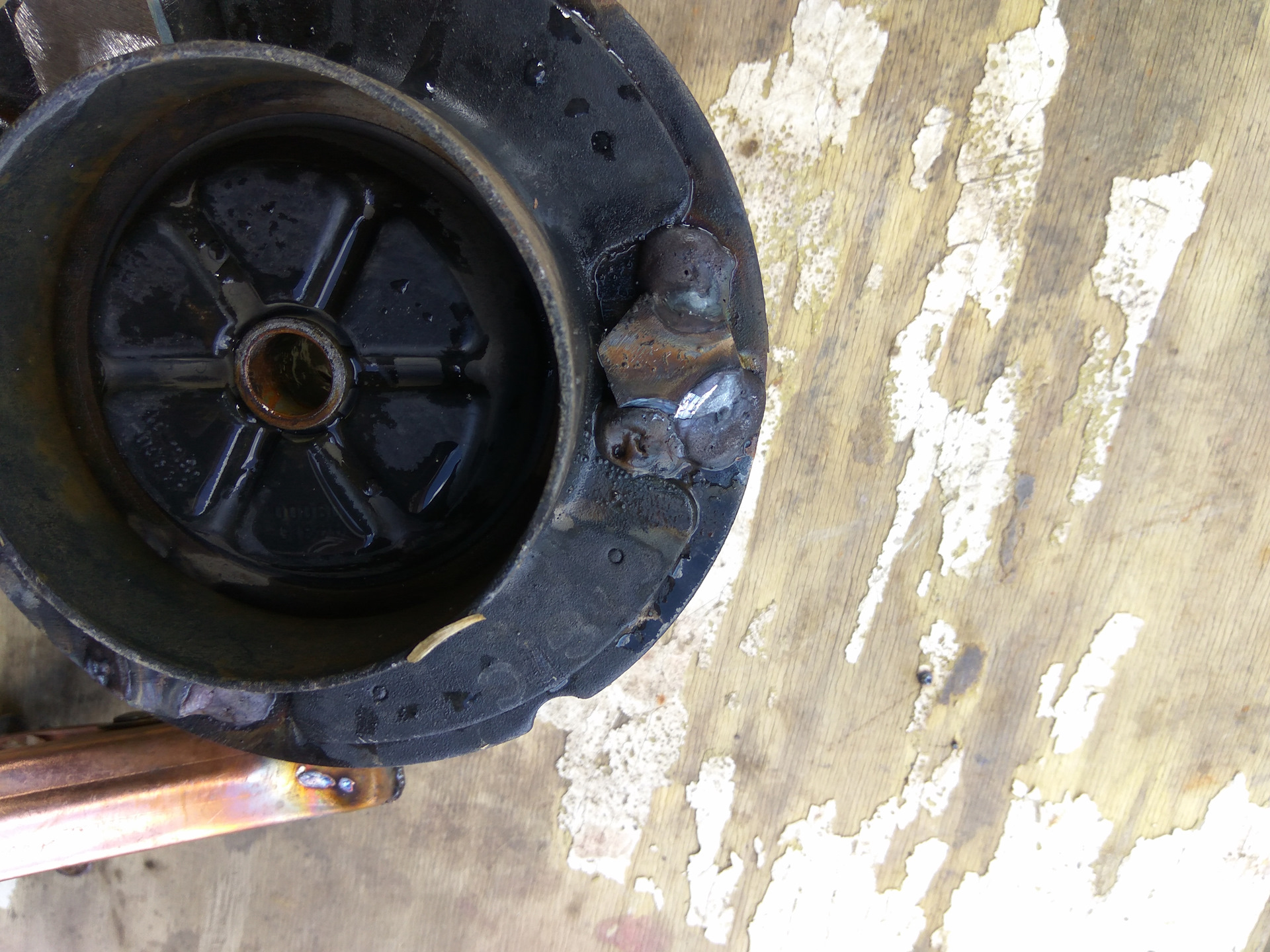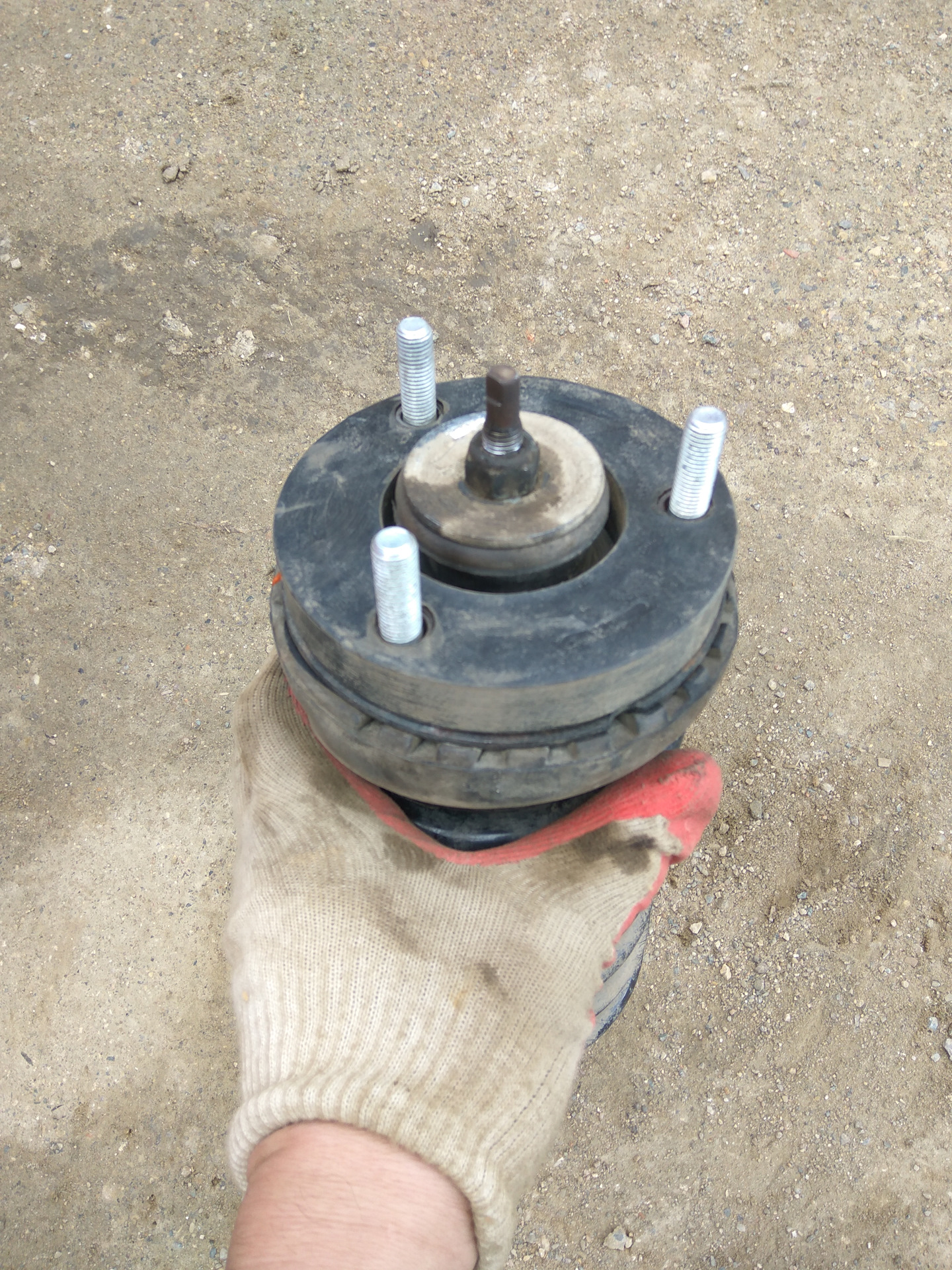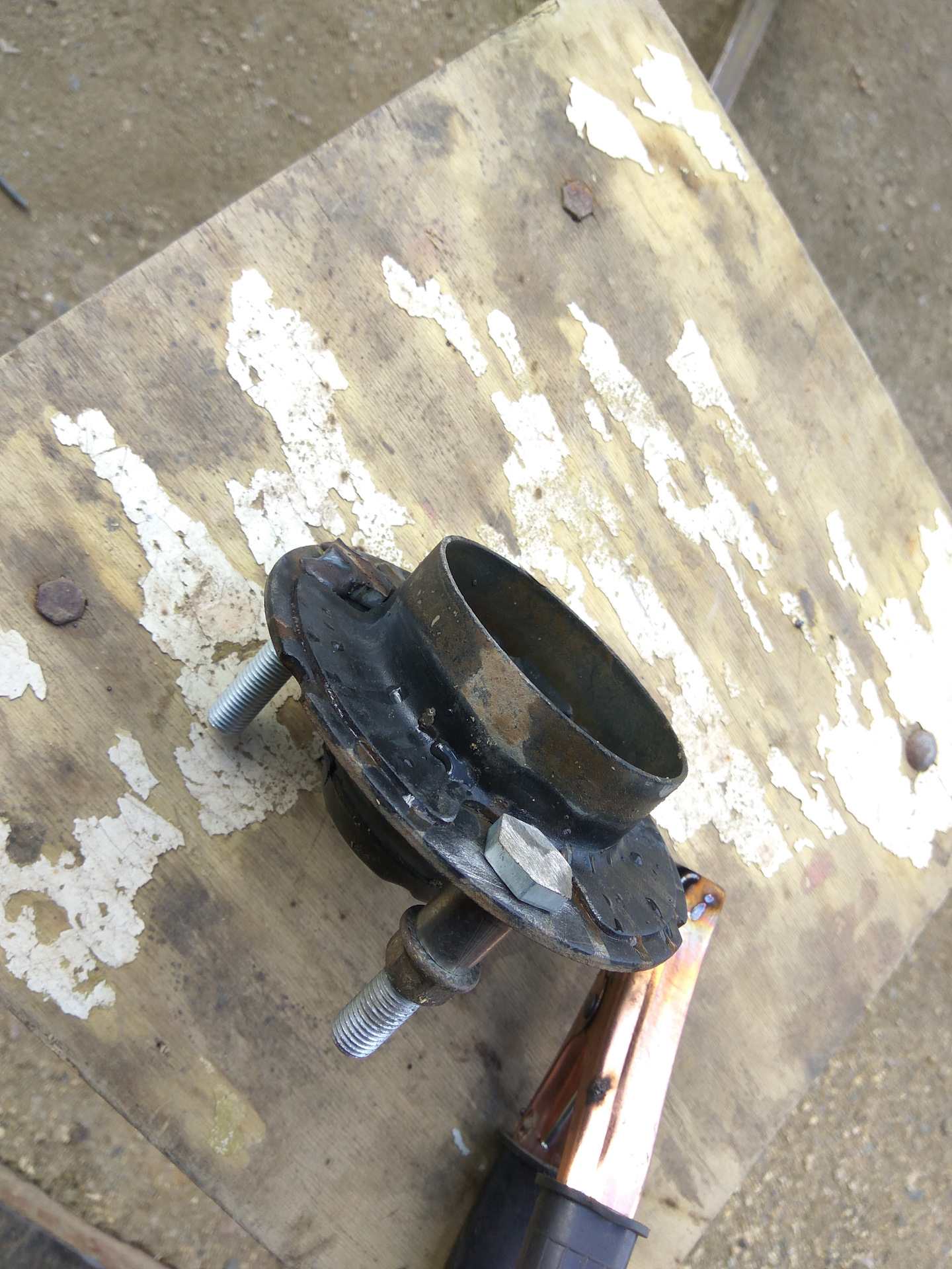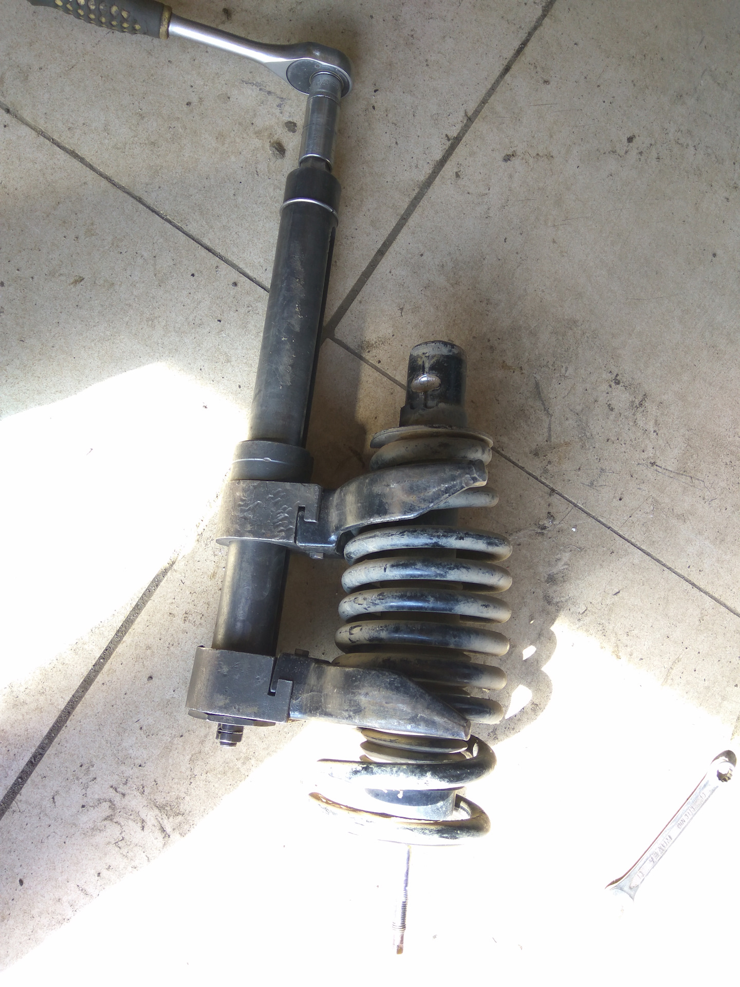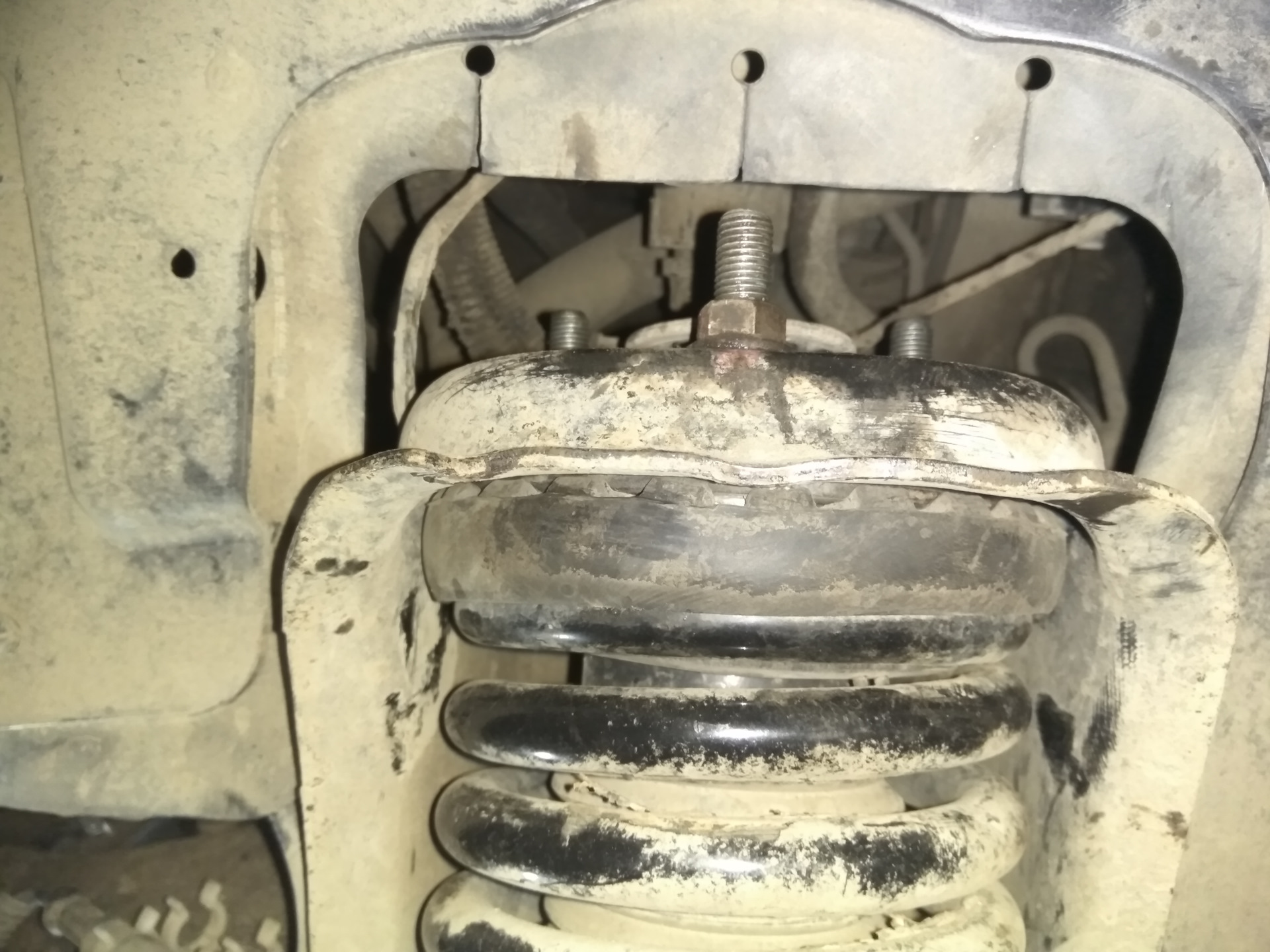Далее нужно было разобрать стойку и заменить болты ( поставить более длинные). Болтов в комплекте не было и посовещавшись со знающими, было принято решение поставить простые, приварив их к чашке. Для разбора стоек, съездил к знакомым в сервис. У них есть отличный аппарат для стяжки пружин.