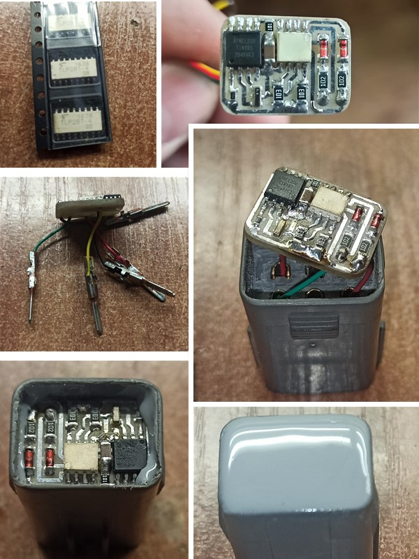 Ради спортивного интереса захотел встроить весь эмулятор в саму фишку. Заказал с Китая разъем, выбрал микроконтроллер Attiny85, диоды как и в первом варианте использовал импульсные 1N4148, так-как выпрямительные 1N4007 и ему подобные немного не уместны. Оставался вопрос в оптронах, PC817 и подобные занимают очень много места, тогда мне и пришла дикая, но рабочая идея, взяв TLP281-4 я отпилил 2 ненужных оптрона из 4х.