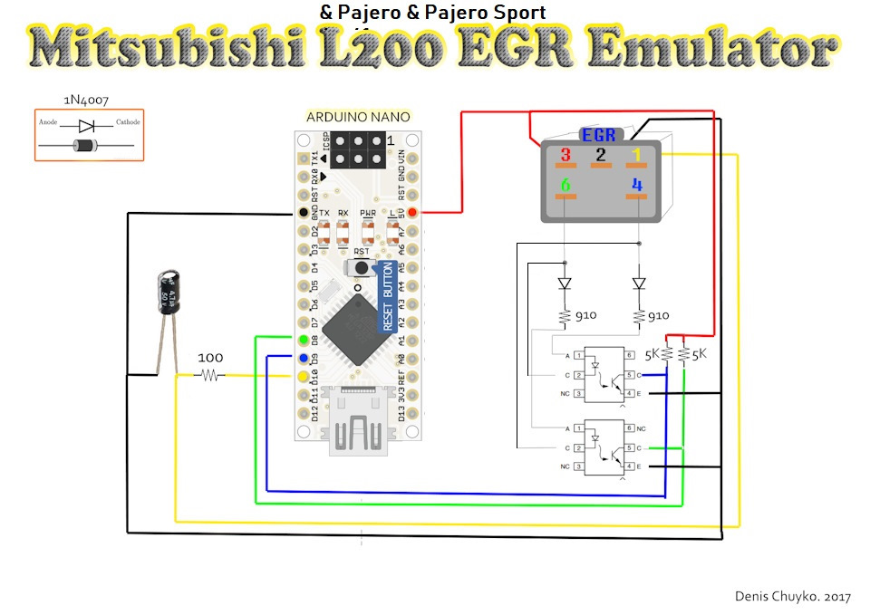 Сегодня утром собрал на скорую руку данную схему, вместо рекомендуемых автором оптопар, использовал транзисторную оптопару "PC817" можно найти в компьютерных блоках ATX, диоды взял тоже из блока. Оно заработало! Правда, в моем случае, ошибка уходить сама не захотела, пришлось сделать сброс сканером. Розетку взял от раскуроченного клапана EGR.