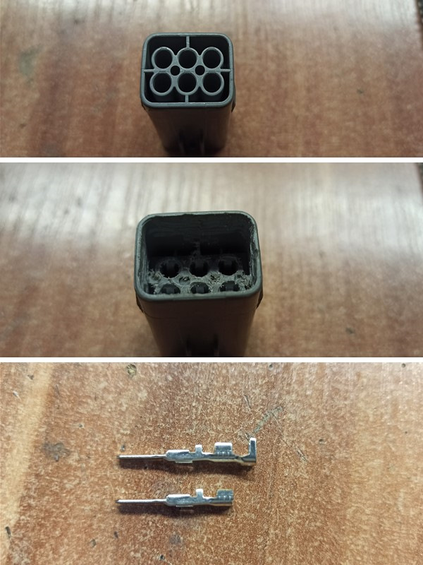 В фишке бор машиной убрал лишний сантиметр глубины, предназначенный для резинового уплотнителя. Ламели (контакты) укоротил и подпилил, припаял проводки и вставил всё в корпус.