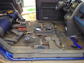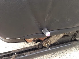 Скинув клемму с аккумулятора я занялся демонтажом передних сидений. Сам процесс не сложный, снимается пластиковая накладка сзади сиденья и две пластиковые заглушки спереди и получаем доступ к 4 болтам на 14. Откручиваем их и опрокидываем сиденье назад для отсоединения пару клемм. После того, как клеммы скинуты, сиденье вытаскивается из машины для натягивания чехлов.