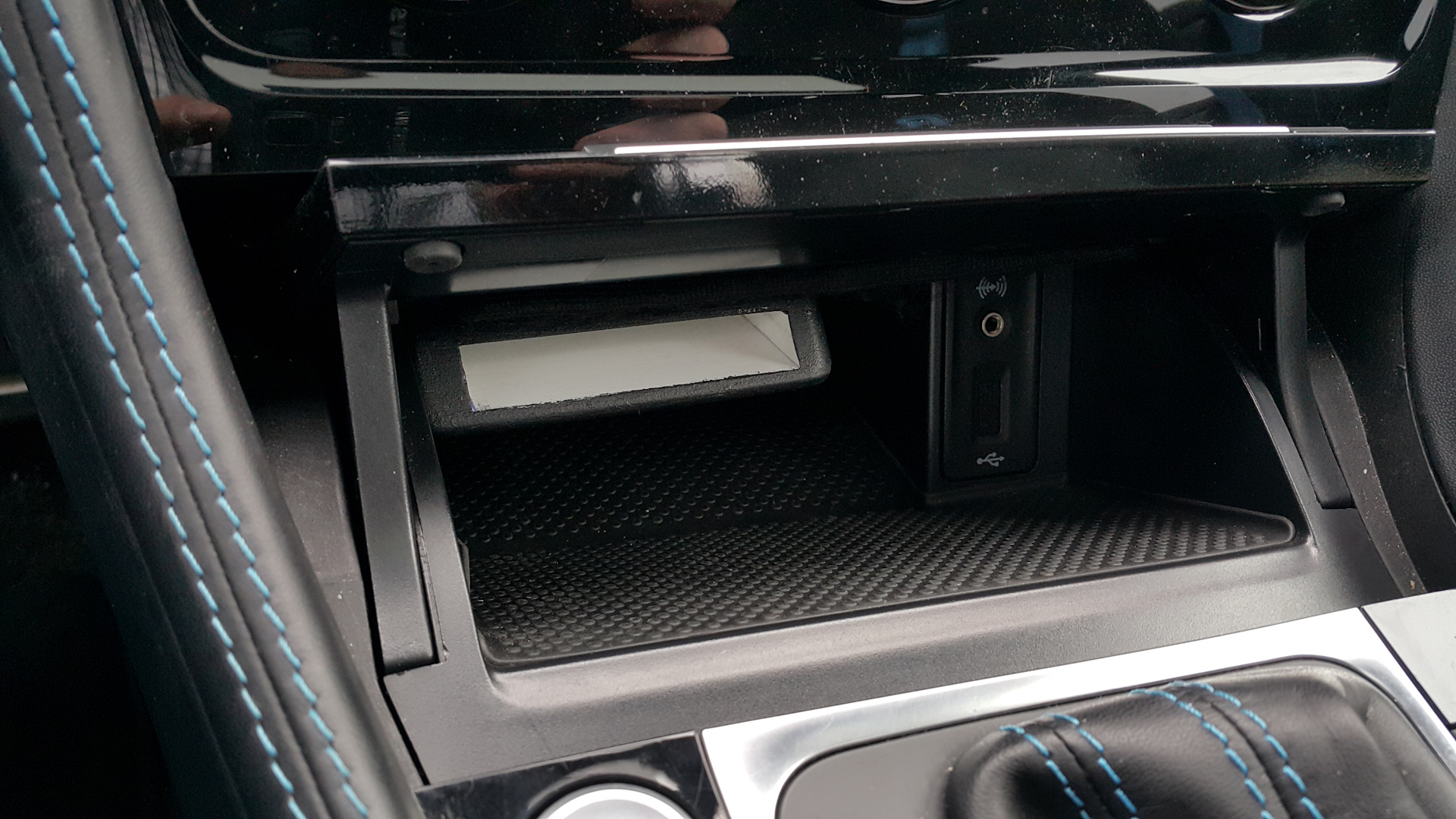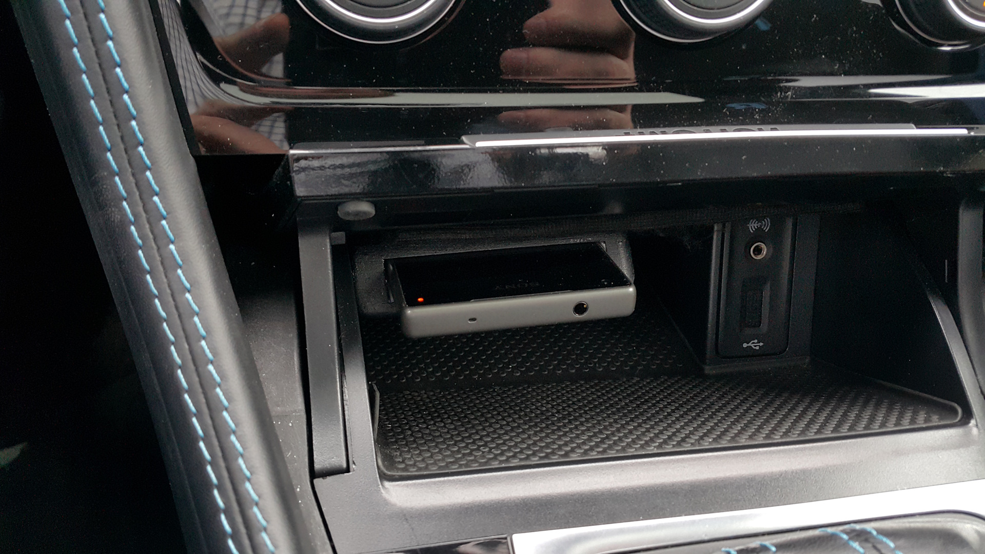 Мой E5823 сразу покупался как второй телефон исключительно для машины, и SIM-карту в него я не устанавливал – интернет по WiFi в машине раздает MIB2 со встроенным LTE-модемом. Так и связь лучше, и телефон меньше греется. Чтобы не путаться в проводах, Олег Zebr организовал док для иксперии в кармане под климат-контролем. Док постоянно подключен к штатному USB-разъему, прежде жившему в том же кармане, а теперь спрятанному в недрах приборки.