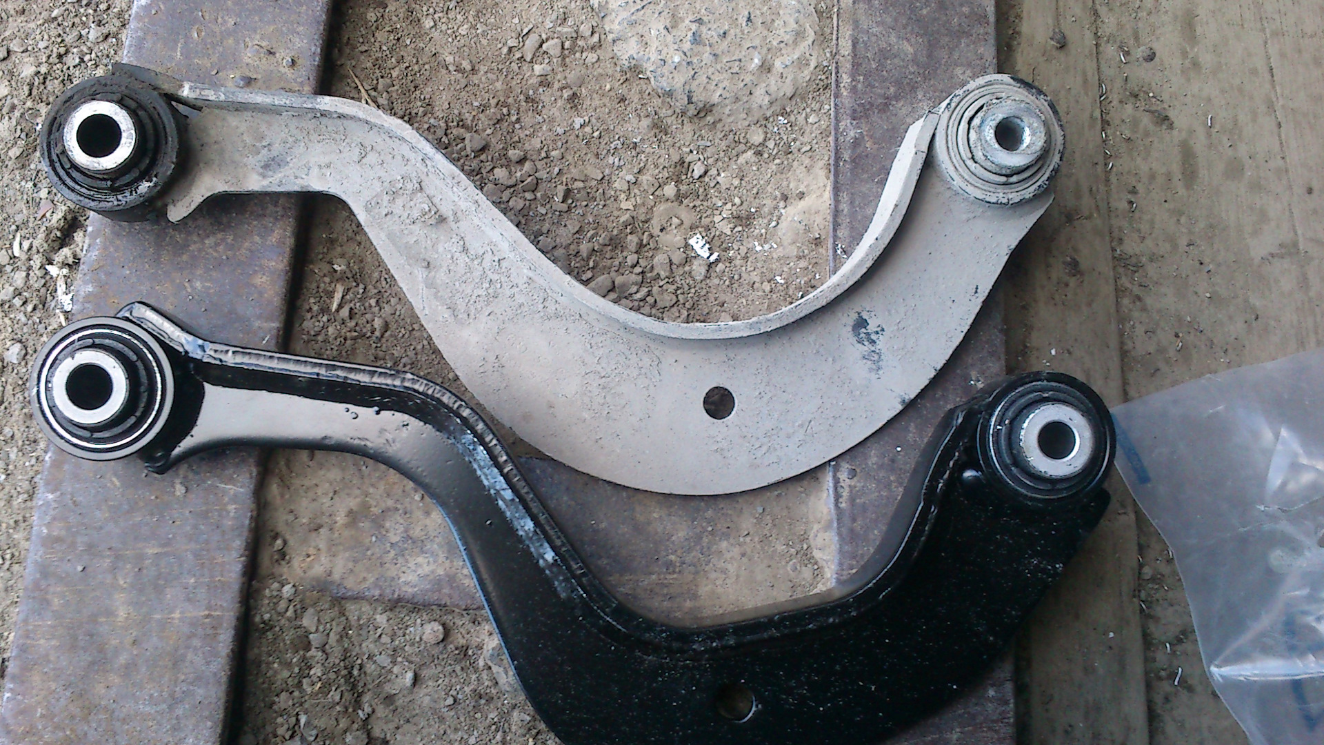 4. Рычаг подвески, поперечный верхний. Сайлентблоки Lemforder 29918 01 и Lemforder 29919 01. Тут я заморачиваться не стал, а взял рычаги в сборе Lemforder 35463 01. Спросите почему, отвечу, если брать два сайлента, выходит 950 рубликов, а рычаг в сборе 1050, вот как то так). Да, сами рычаги имеют маленько другую форму в отличии от оригинала, но по дыркам расстояние один в один.