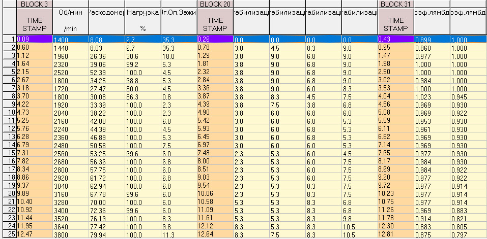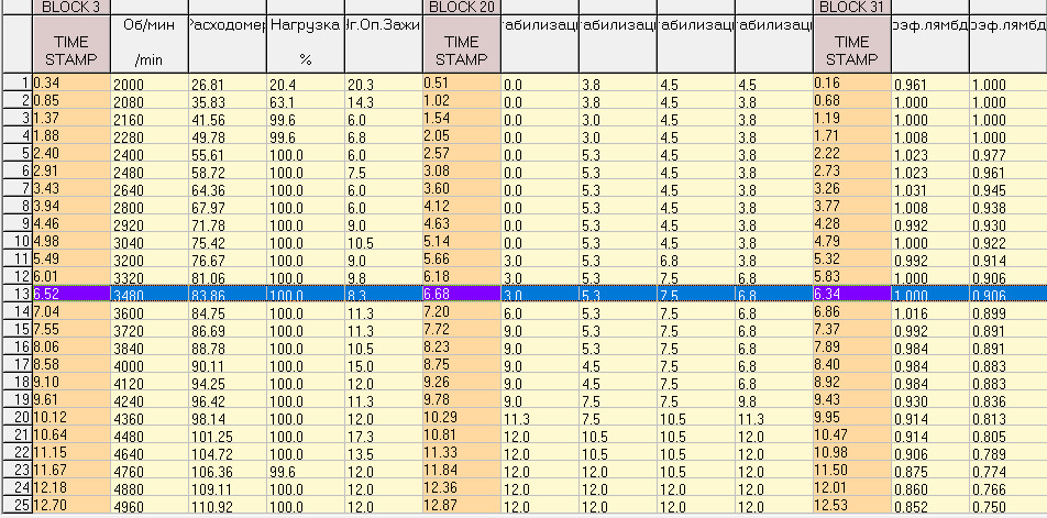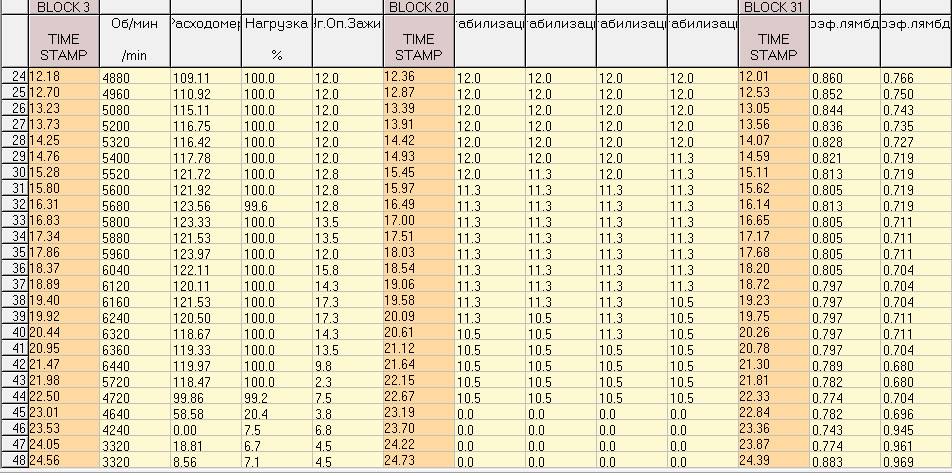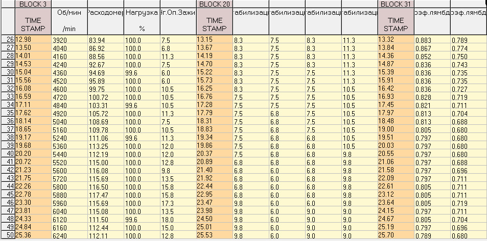 Я посмотрел по 31 группе, первый столбик факт, второй столбик запрос. Если запрос у тебя вполне нормальный в прошивке, то факт относительного него беднит. Цифры ближе единице, к примеру надо 0,750, а у тебя 0,850. А 0,850 ближе к цифре 1. Значит беднит, чем ближе к единице, тем беднее смесь.