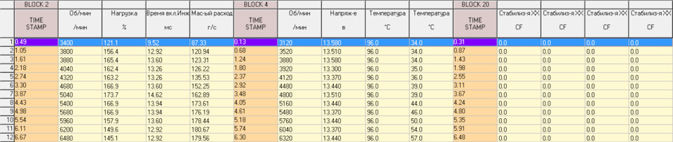 Вот пример, у меня 1.4 бар наддув, по 20 группе нули. То есть так и должно быть у здорового мотора на всех оборотах и передачах.
