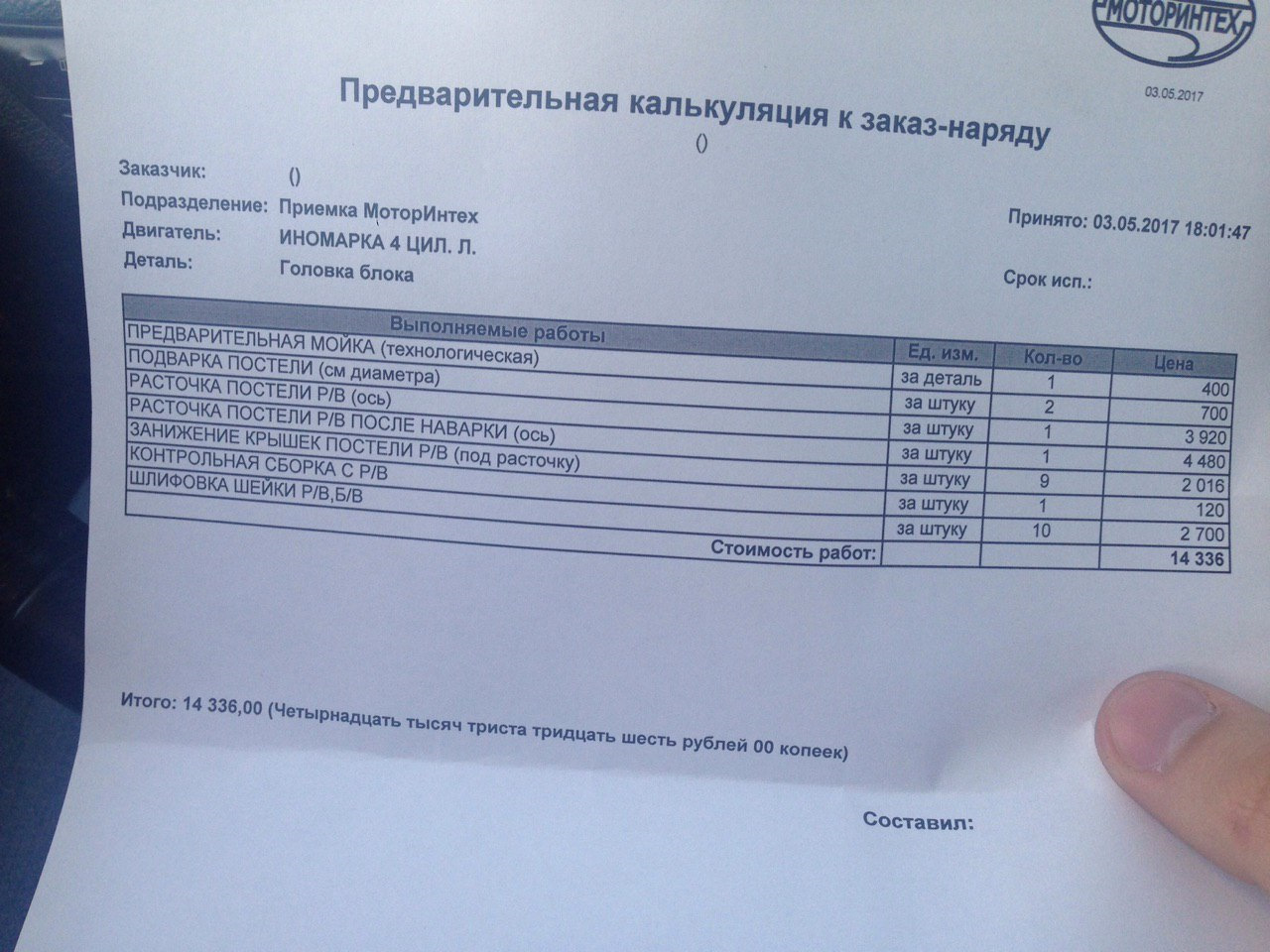 Хотел бы выразить благодарность сотрудникам ООО "МоторИнтех" за качественную работу, в частности Мастеру-приемщику Юрию за уважительное отношение к клиентам. За неделю они выполнили всю работу по восстановлению постелей, как и обещали. Вышло мне все это в 13тыс, а рабочая б/у ГБЦ стоит около 50 тысяч.