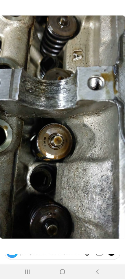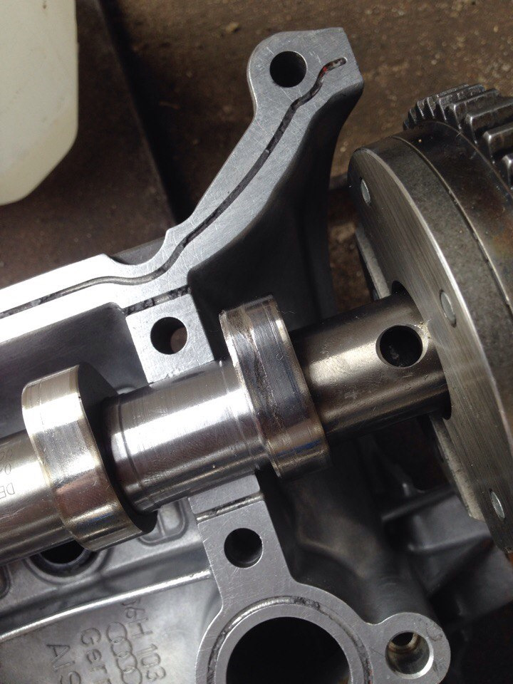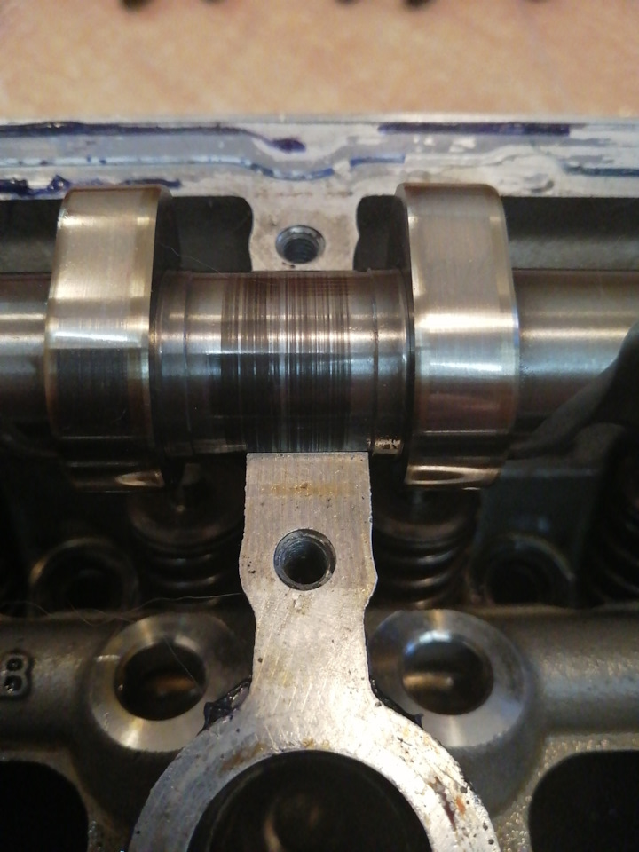Снимаем крышку и видим, что выскочил гидрокомпенсатор, попал под распредвал, а тот в свою очередь расплавил постель распредвала… Картина — жуть. Непонятно, почему рокер так выскочил, либо просто масла насос не накочал, а распредвал сам первым делом зачесал постель. Факт на лицо — испорчена головка, крышка клапанная. Стоит это не дешево. Хотел восстановить головку в "Механике", но они отказались, что все равно ничего работать хорошо уже не будет. Нашел другую компанию ООО "МоторИнтех", в которой взяли мою ГБЦ в работу. Распредвал немного поврежден, но некритично, биения нет, так что решил оставить старый (новый стоит минимум 30тыс.) Вот что подпортилось на валу: