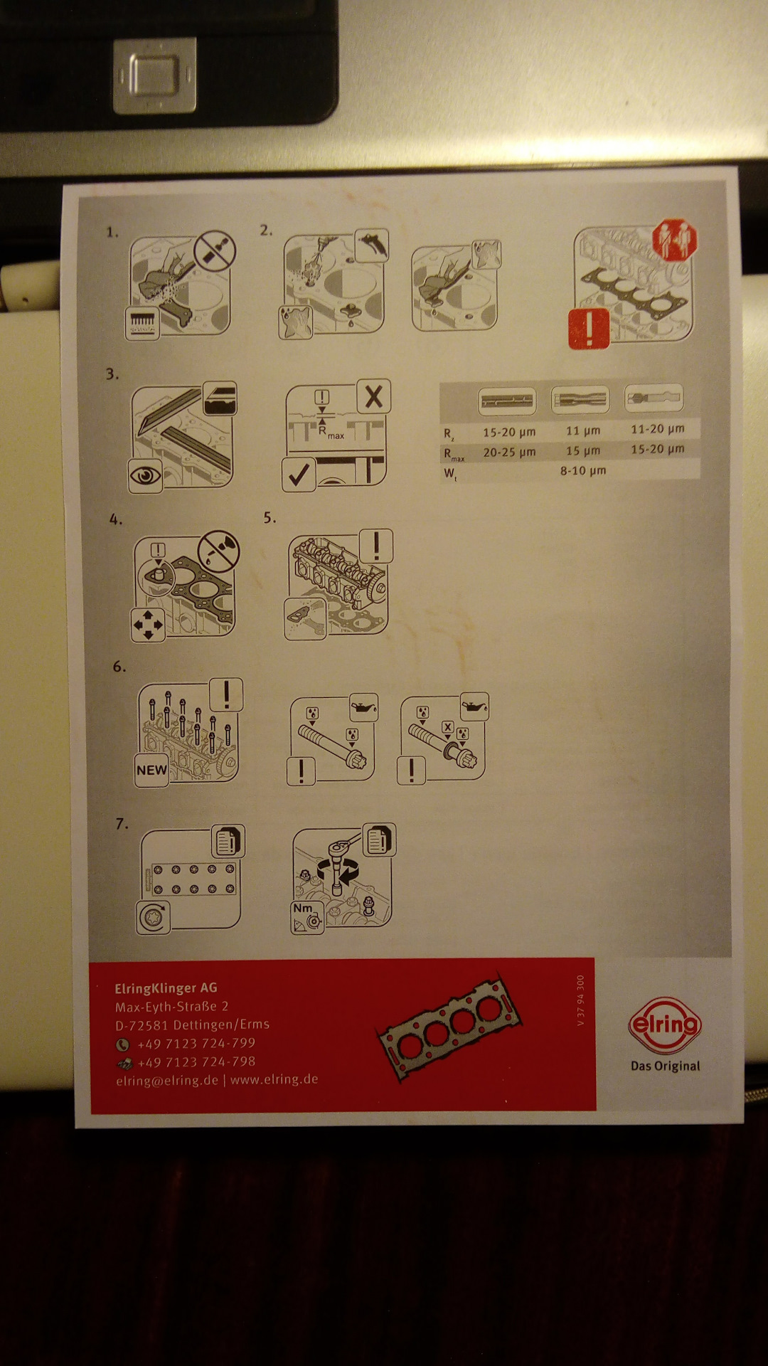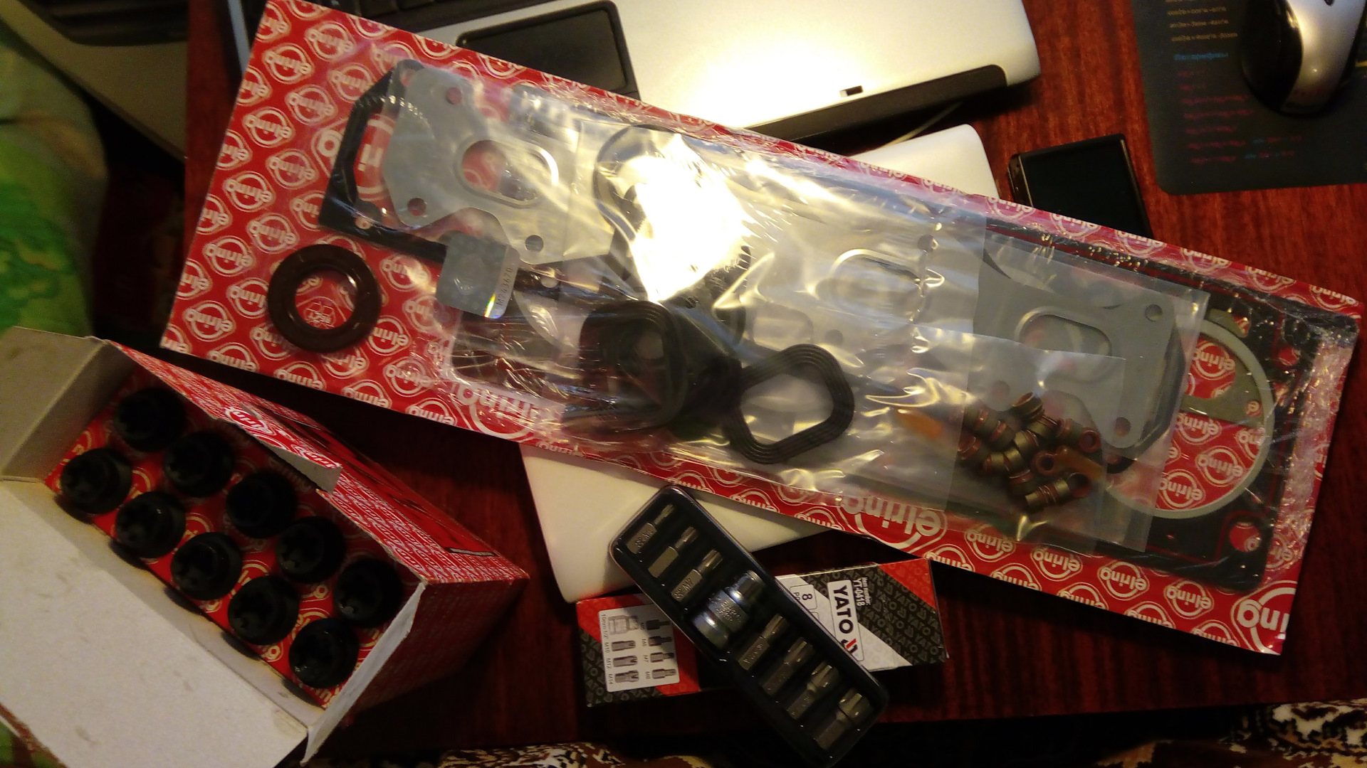 ٧ Купил прокладки для ГБЦ комплектом, и новые болты. А также по совету хорошего человека (Кирилл Крышен из Новополоцка) приобрёл комплект вставок (бит) Ribe с держателем, хотя сначала хотел взять только М8 и М12. Отправлю детей на летний отдых и займусь машиной, чтобы никто не отвлекал. По расходам, если интересно: сохранил табличку (не только текущие). Сниму ГБЦ, тогда дозакажу ещё запчастей, какие понадобятся (один выпускной клапан точно надо, возможно и втулку к нему), масло и масляный фильтр. Ещё заметил, что не работает клапан рециркуляции воздуха в салоне (всегда открыт забор с улицы, жужжит, но не закрывается) — хотел испаритель кондиционера продуть антисептиком, возможно там тяга слетела. Кто сталкивался — подскажите! Ещё вопрос по комплекту сальников клапанов: для чего в наборе нужны две оранжевые фигнюшки? И по порядку затяжки болтов: у двух разных производителей (Elring, Payen) разные схемы. В книге — как у Elring, значит у другого — не правильно?