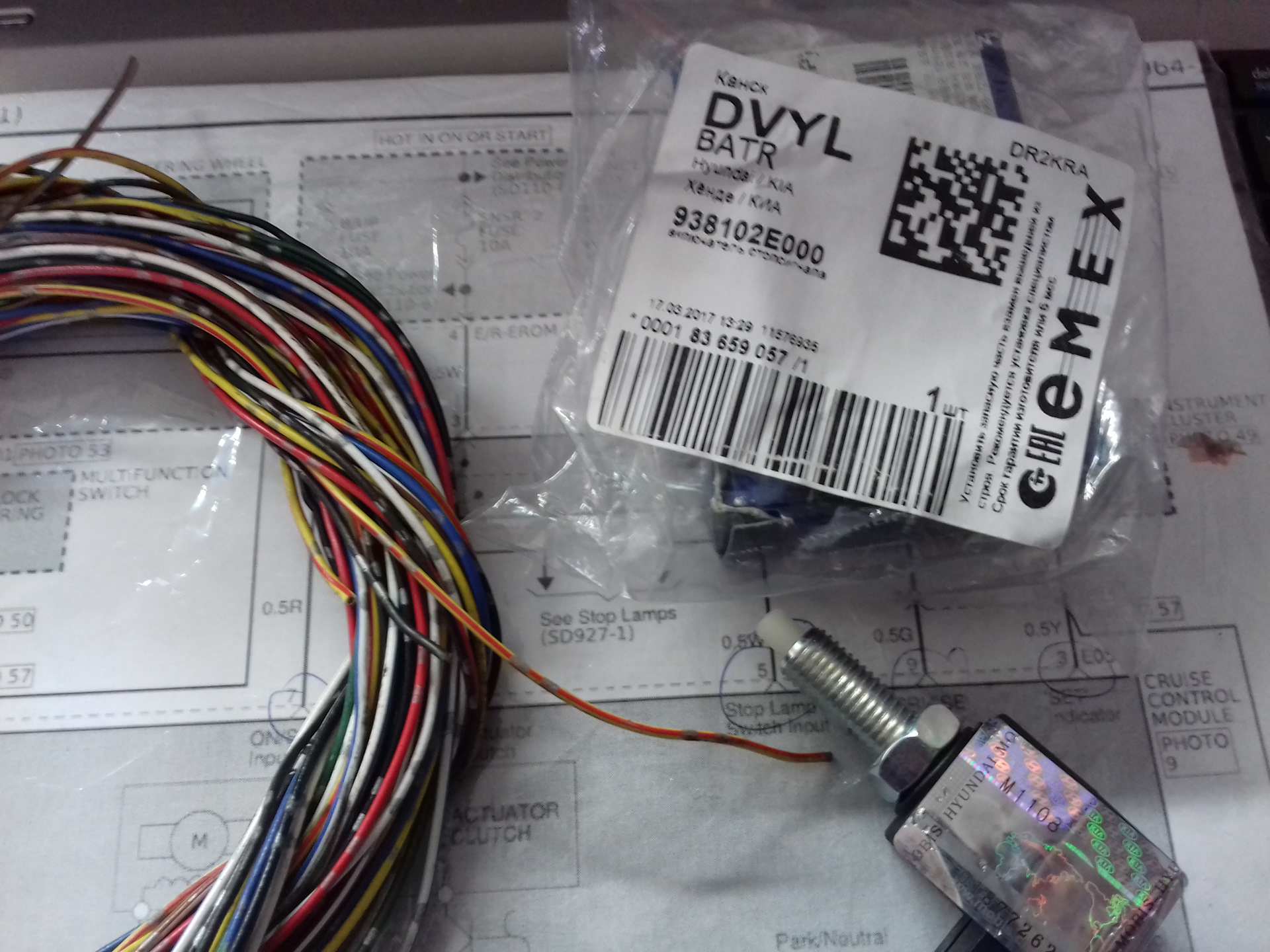 Из заводской проводки нам досталось только то, что от шлейфа (улитки) и от приборки идут пять проводов на ЕМ21 (находится в райне USB) и с приборкой повезло, светики индикации КК в ней так же оказались. И того это пять проводов из 10, тянем ещё три от лягушек сцепления и тормоза, и ещё один от датчика скорости, есть на магнитоле(M54a первый пин), получается 9, ну а 10 провод от КК это корпус.