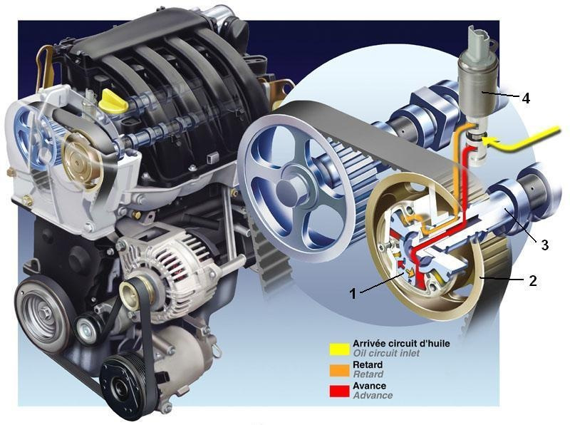 На впускном валу у F4R и некоторых других двигателях есть так называемый "фазовращатель". Он позволяет смещать положение распредвала относительно "нулевой метки".