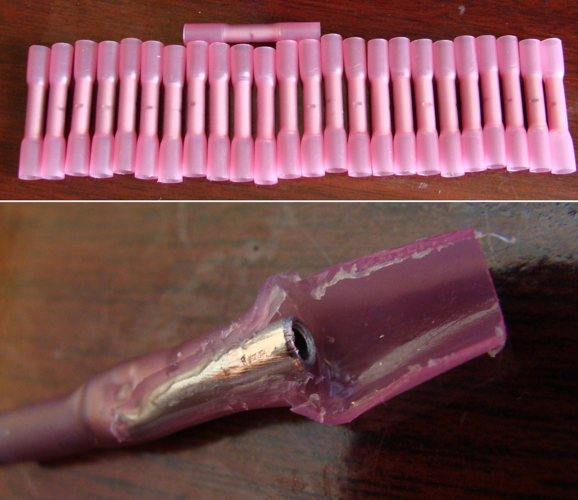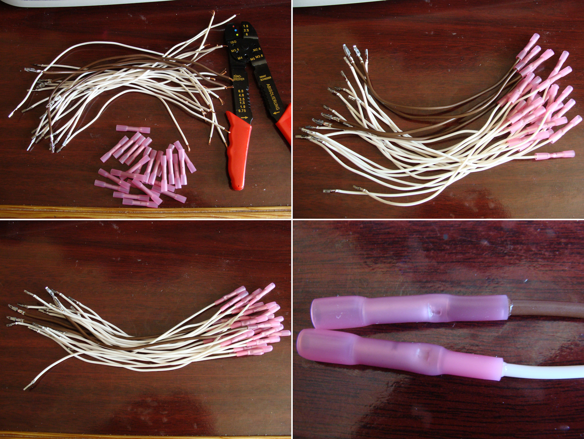 4) обжимаем гильзы, пофигу какие куда, главное тонкие провода к тонким, толстые к толстым. термоусаживаем гильзы.