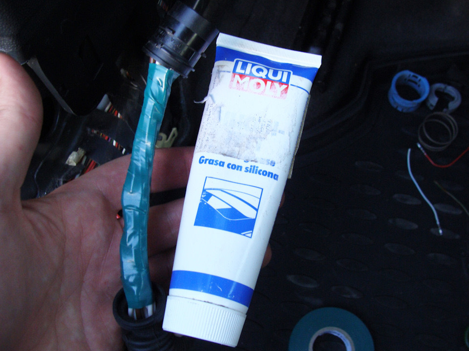 Я поступил так: прикинул как будет изгибаться проводка в гофре, изогнул ее как надо, в таком положении обмотал изолентой участок, который будет находиться в гофре, нанес поверх изоленты смазку LIQUI MOLY Silicon-Fett (арт 3312)