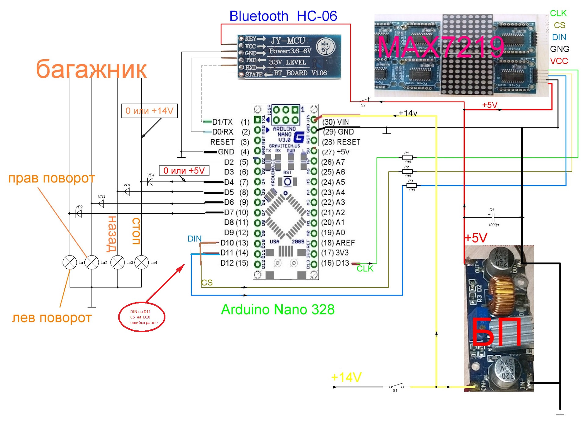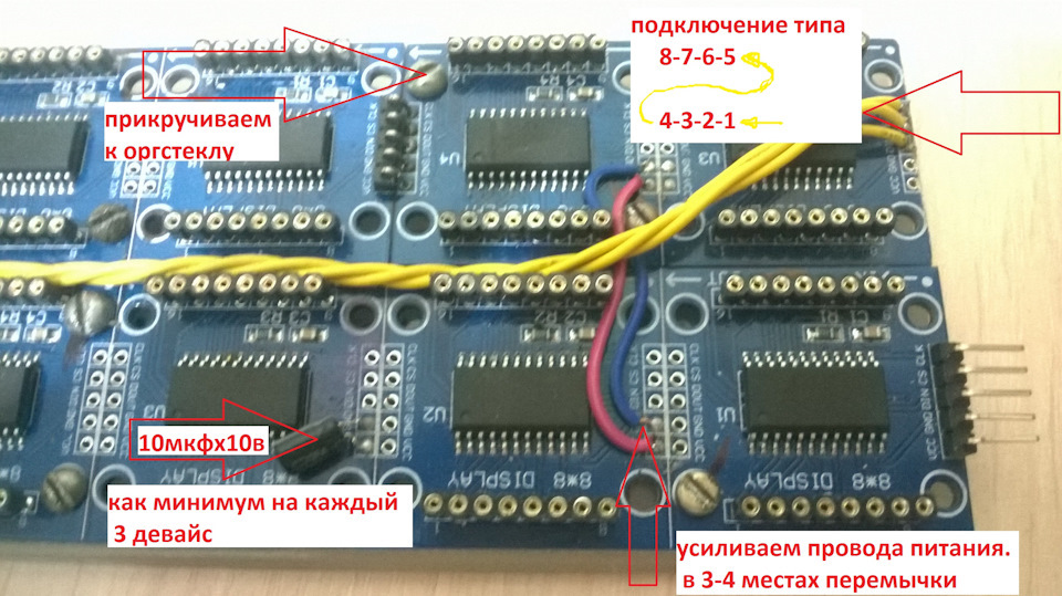 Доброго дня! Спасибо за классный проект! Собирал. Есть пару глюков, может сталкивались? Вся линейка запускается. Питаю от стационарного БП (в машине встречается гораздо чаще). Потом минут через 5-10 самопроизвольно перестаёт работать либо полностью один сегмент матрицы, либо часть его. Либо наоборот зажигается и горит полностью. Текст идёт сквозь этот сегмент нормально, то есть MAX не индицирует инфу. После прочитки мануала на MAX оказалось, что все микросхемы от нуля градусов, заказал на Алиэкспресс с другим индексом, от -40 градусов. Перепаял, потому как после взрыва БП на 3 А сгорело пару микросхем. В машине даже пришлось над табло приклеить зеркальную бумагу, чтоб видеть, взглючило оно или нет. Потому как запуск неустойчивый, может пикнуть, но дальше не реагировать на пульт. Конденсаторы 10 мкФ напаял на каждый модуль, плюс через один добавил керамику К10-17 на 0,047 мкФ. Уже сгорело несколько ардуин. Причина на мой взгляд: я запитался от заднего прикуривателя, а он не выключается при выключении зажигания, я поставил там реле и выключателем его на массу включаю, т.е. протянул тонкий провод к месту водителя. Так вот когда забываю его выключить, закрываю машину и срабатывают замки на дверях. После этого либо ардуина выгорает либо порты некоторые от поворотов или заднего хода. Думаю, выброс идёт напряжения. Хотел поставить ещё одно реле на передний прикуриватель контактами последовательно с выключателем, да не успел — матрицы накрылась в этот раз. При включении треугольник нормальный. Как только бегущая строка — нижний ряд полностью абра-кадабра, верхний нормально отображает. Стационарная надпись иногда нормально, но сегменты периодически отказываю (как выше писал). Пробовал фильтры ставить. Дроссели, кондёры на вход… нет эффекта. У кого-нить наблюдаются такие глюки? Модули Блютуз пришли, а вот дальше собирать не могу, хотя всё есть. Спасибо, кто дочитал до конца) Ну а если кто ответит, тому будет респект))))