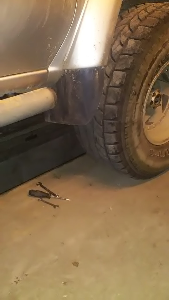 и еще как бы одна мелочь! задалбался я терять (отрывать) и ломать передние брызговики! надоело, да не то что надоело, ценник на контрактные весьма приличный! и китайских заменителей я не нашел! решил заколхозить резиновые… первые на глаза попались уазовские, цена 150 р., срезал надпись уаз, приклепал блестящую железячку и добавил цепочку чтоб под колесо не запрыгивала! теперь не страшно моим брызговикам бездорожье! и бока чистые…))) хотя колхоз конкретный!