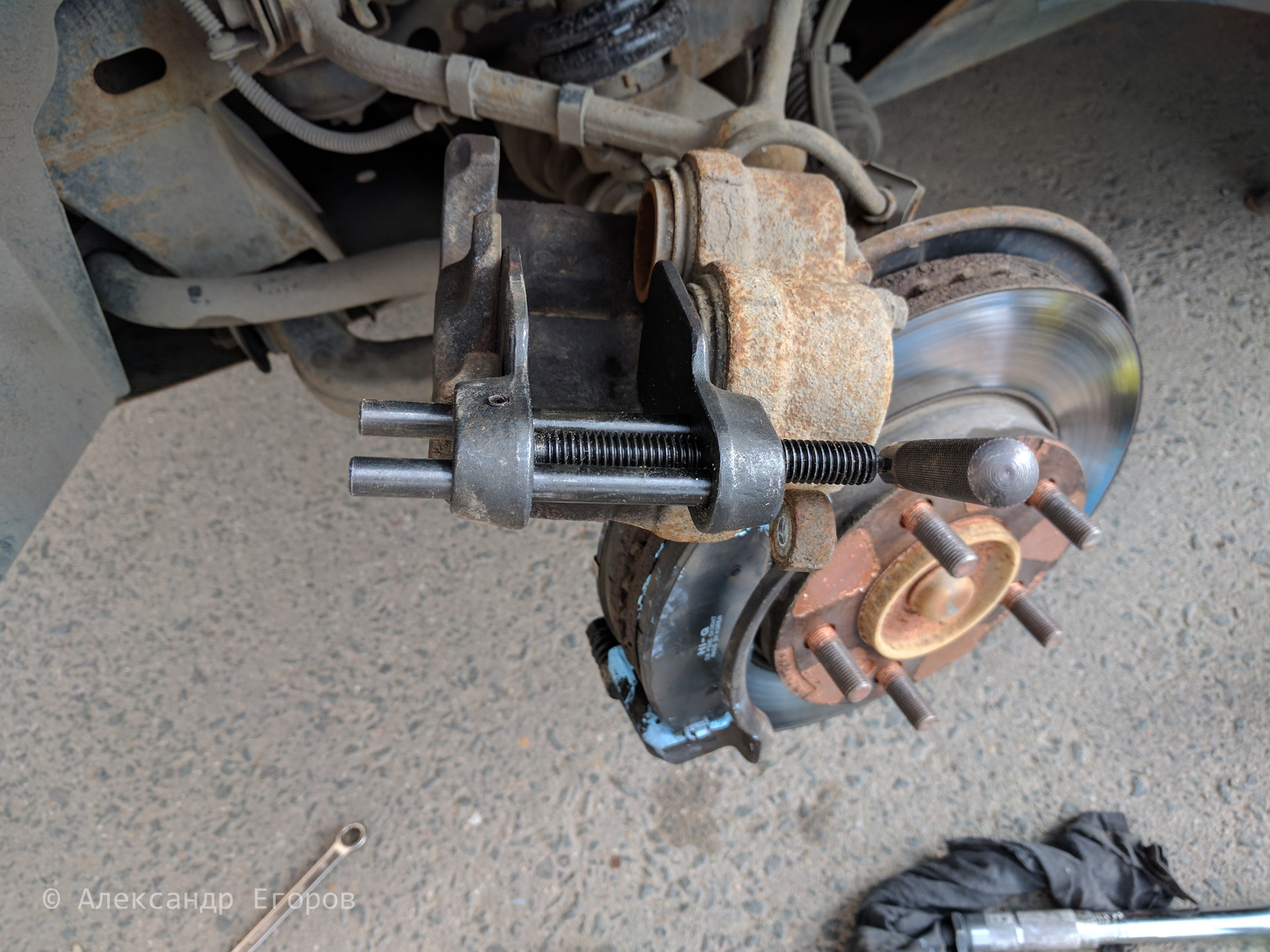 После установки скобы с колодками на свое место, нужно развести тормозные цилиндры в суппорте, с помощью специального устройства (у меня давно куплено) или подручными средствами: