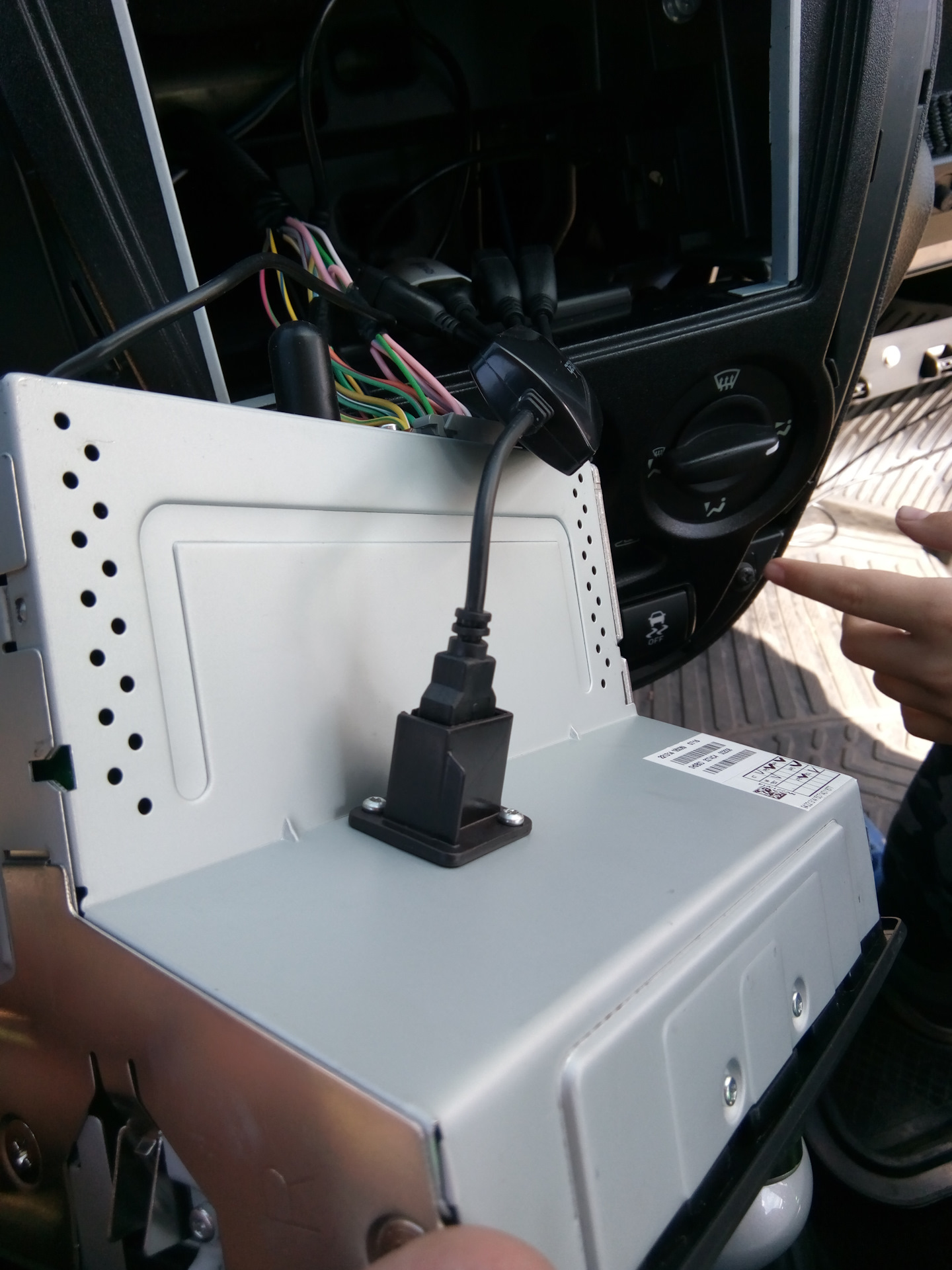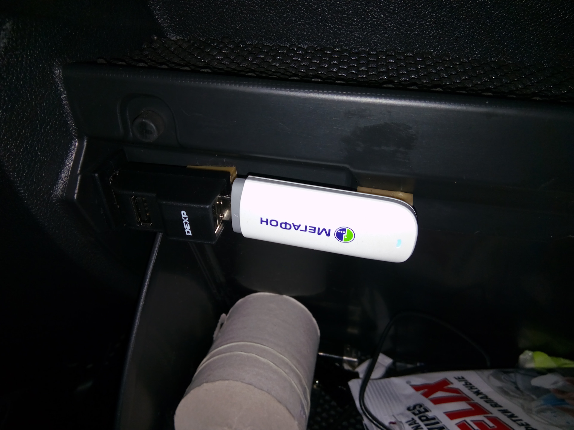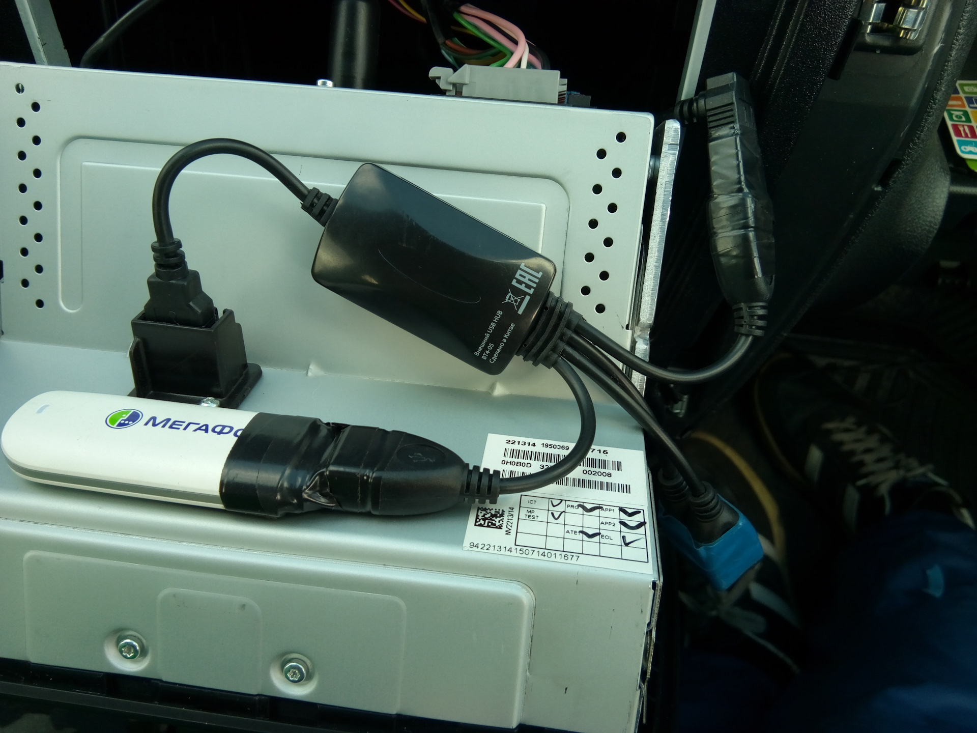 Сначала решил закрепить модем двусторонним скотчем на ММС через хаб, но как то потом не понравилась сложная процедура возврата в сток. В итоге купил другой хаб и вставил его в штатный разъём (болтался под своим весом и весом модема — двусторонний скотч с проставками решили проблему). Плюсом данной схемы является полная обратимость в сток за пару минут (например для ТО у ОД). К стати, если с рабочего стола запустить штатное меню, при следующем включении оно запустится и по долгому тапу "настроек" на рабочий стол не выходит. Выход на него через hard reset (долгое удержание энкодера).