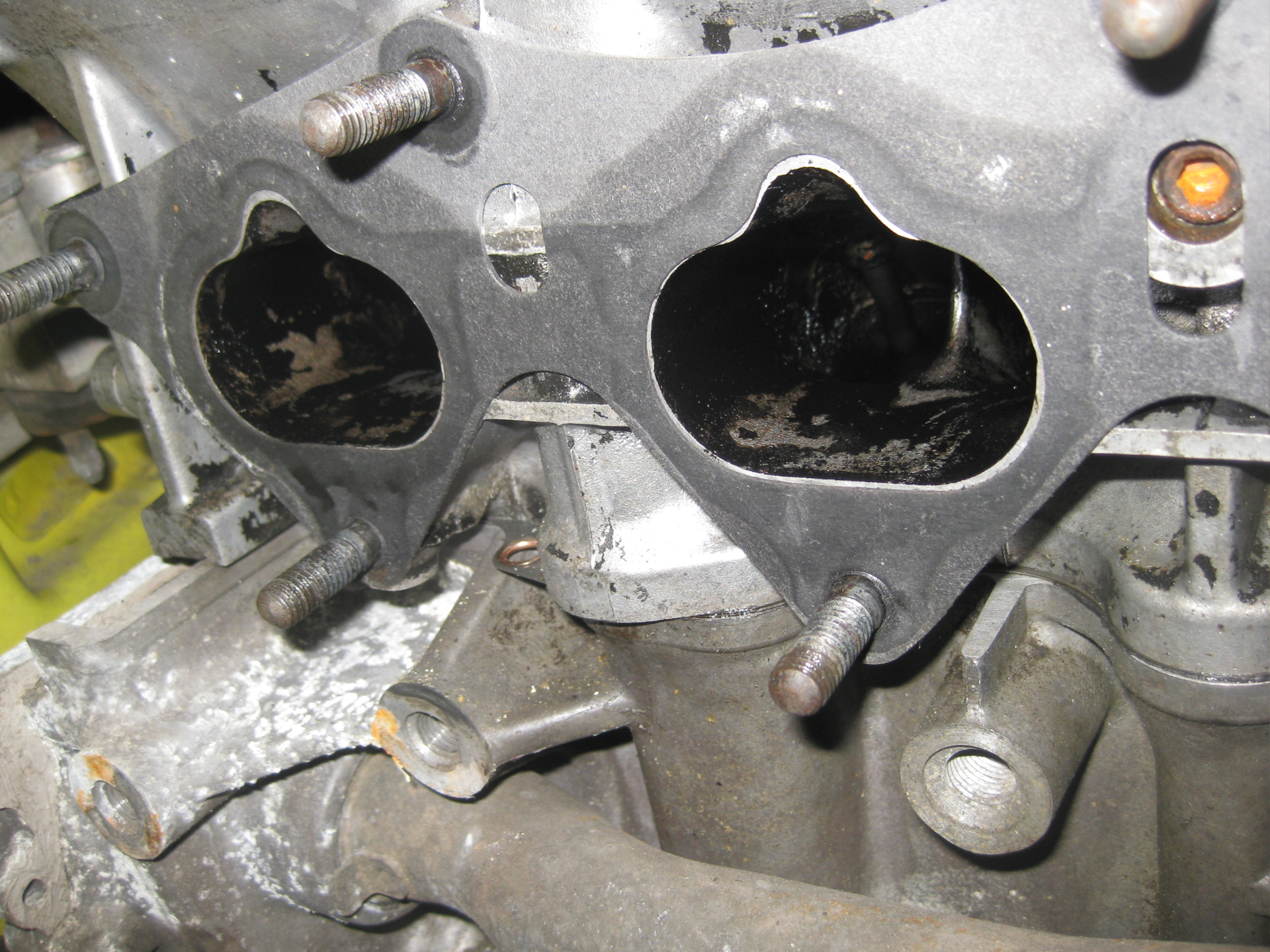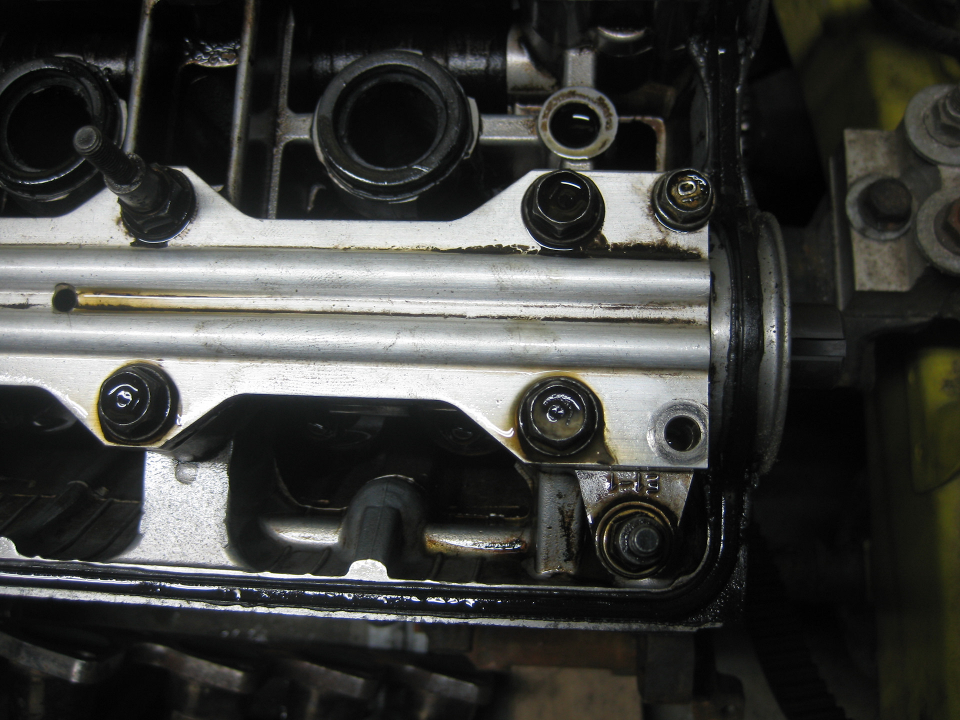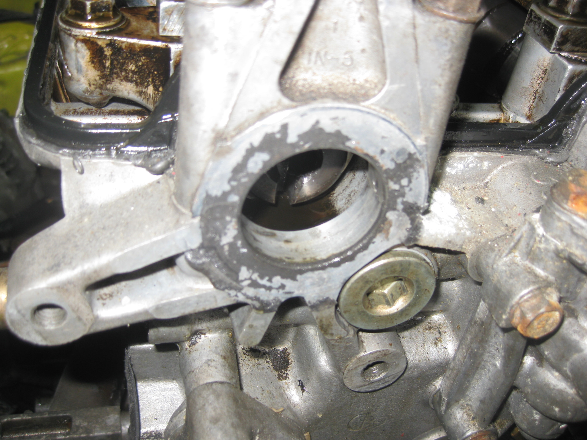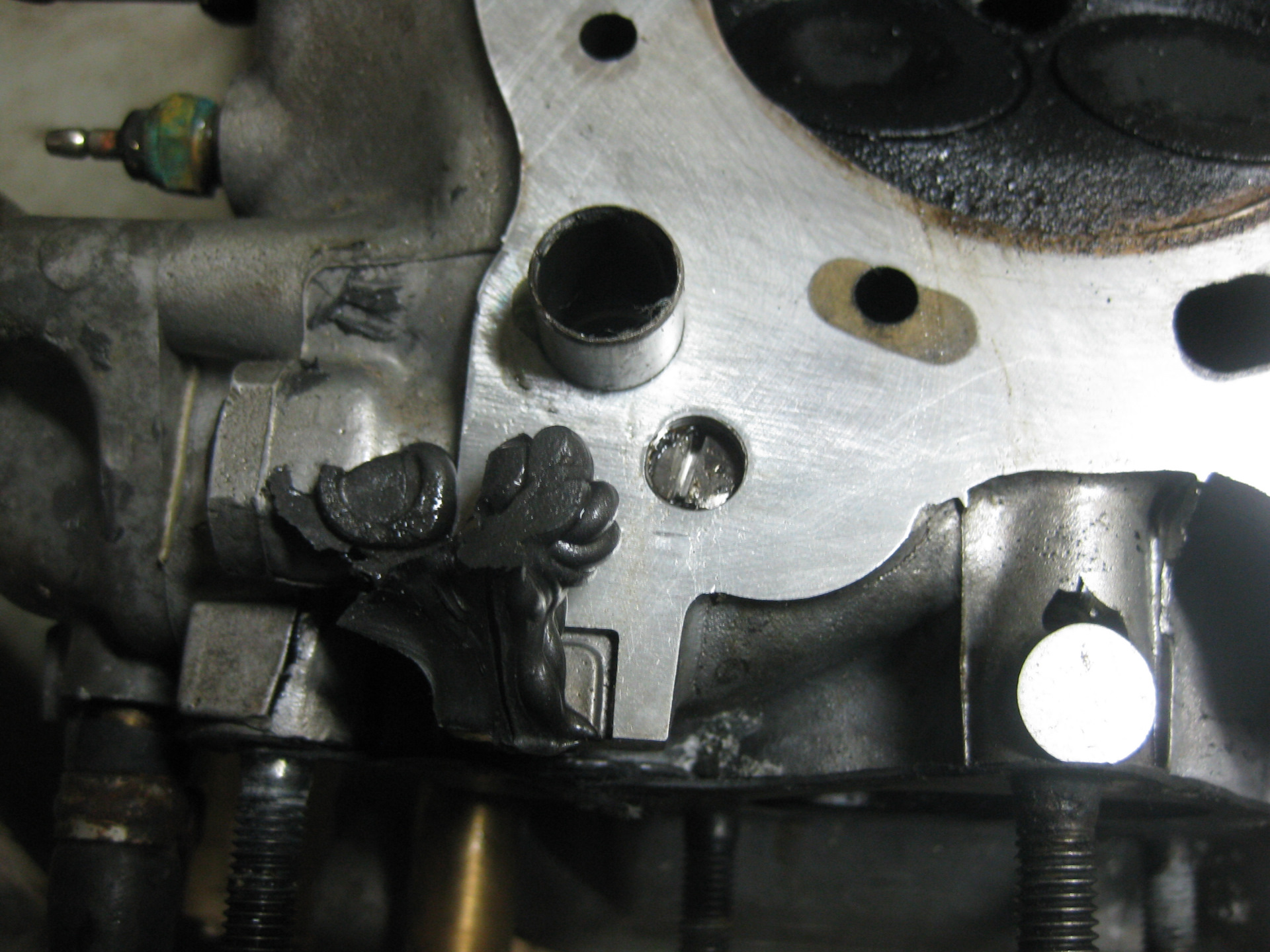 Ну а тут начались опять сюрпризы. Открутил болты трамблера, а он не снимается – оказалось что он тупо по кругу приклеен герметиком. Снял клапанную крышку – не хватает одного болта на седле распредвала, как позже оказалось, там был заломан болт. Все прокладки и сальники были дубовые и стояли на герметике.