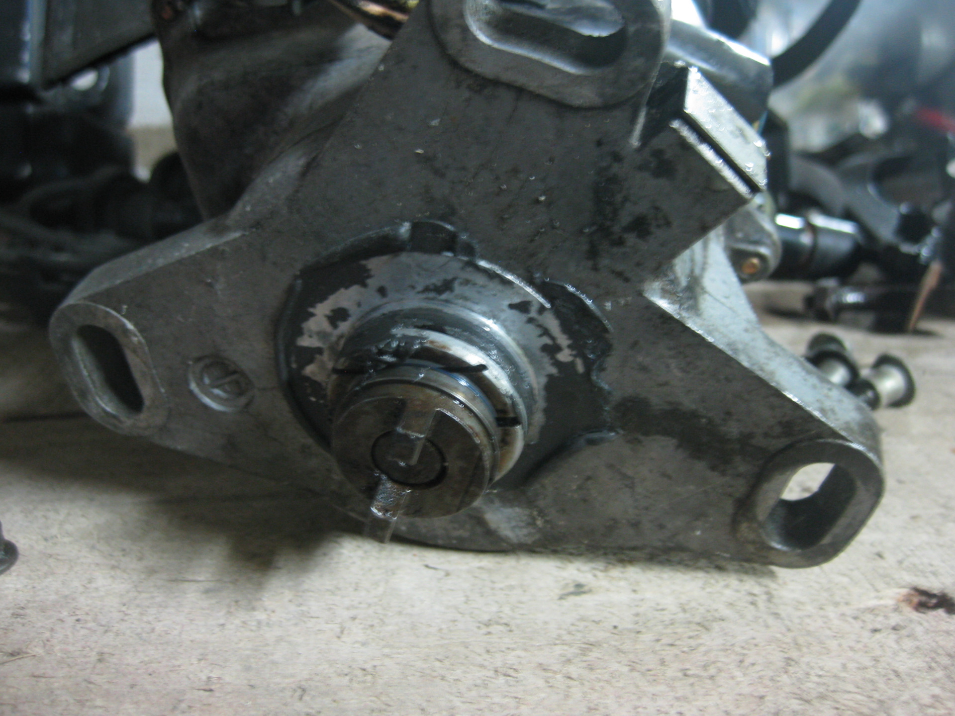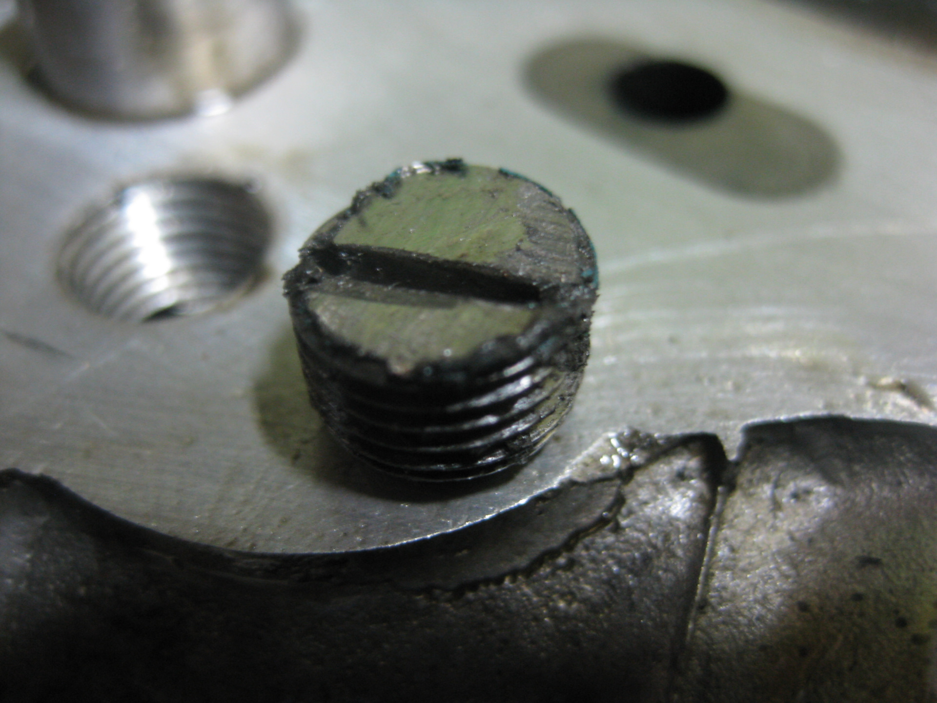 Итак голова снята, а вот и та самая злосчастная заглушка, ее роль выполнял кусок отрезанного стального болта, с прорезью под плоскую отвертку. Удивительно, почему текло масло, не правда ли?