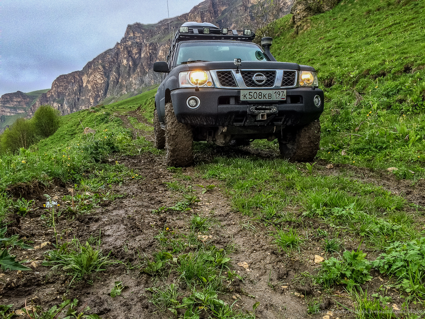 Где-то на полке со стороны Хазнидонского ущелья местный внедорожный клую допустил ошибку пилотирования и не удержал автомобиль на полке. На youtube есть небольшой