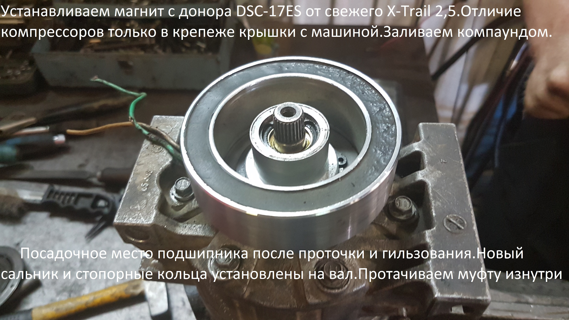 Заливаем компаундом кольцо магнита и проверяем все досконально.Теперь все как и должно быть на новом компрессоре.Муфта при легком вращательном усилии долго и бесшумно вращается, без намека на люфт, при подаче питания на магнит (имитация включения кондиционера ) муфта зажимается и происходит вращение вместе с валом компрессора.