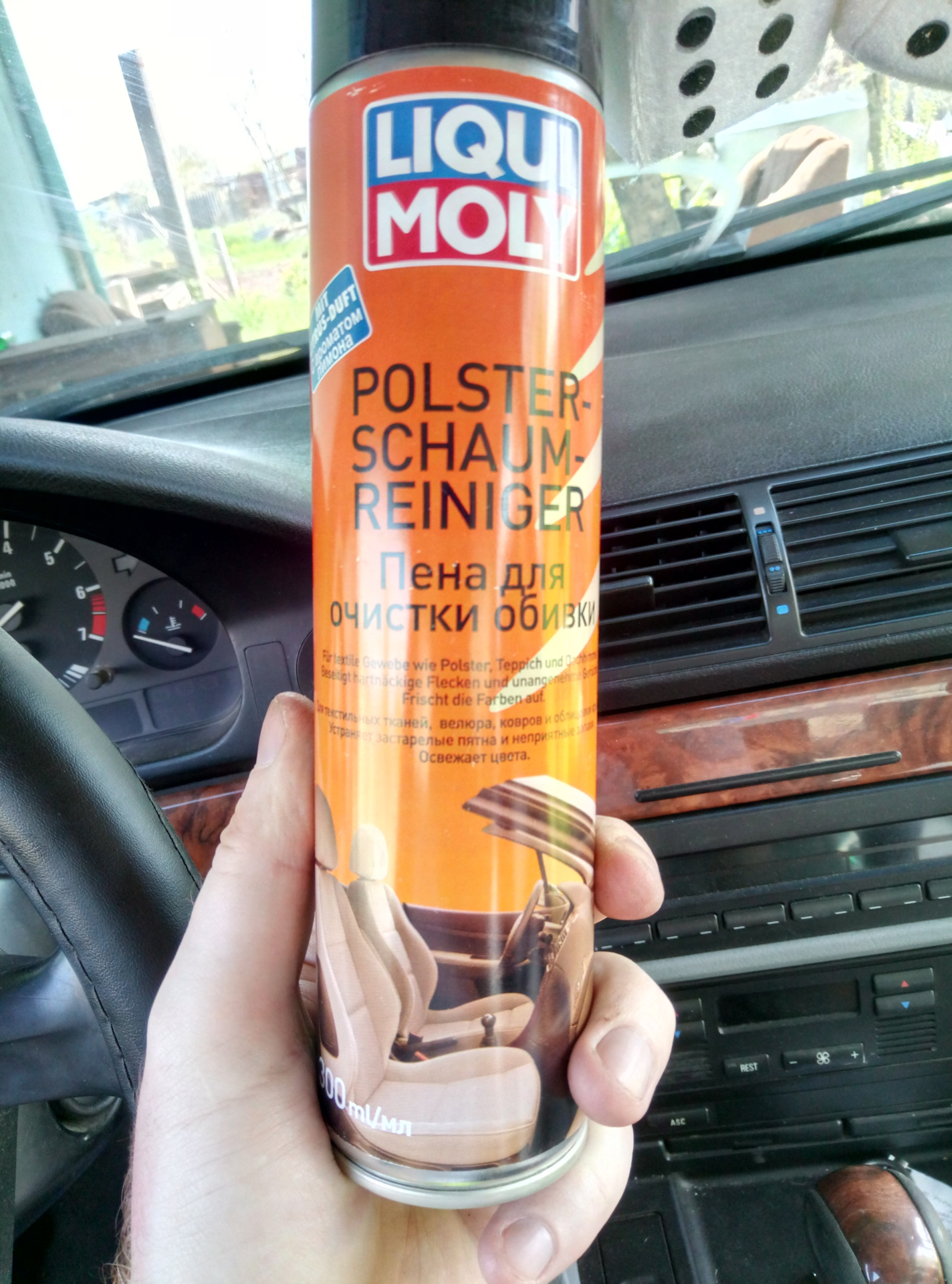 Автохимия для очистки обивки салона от Liqui Moly. Чистил в 2 захода с перерывом месяц. Потрачено 2100 рублей и 3 баллона этого очистителя.