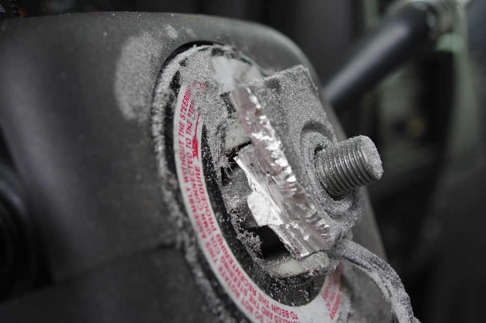 Итак, после 1 полноценного вечера сношения с рулём стало ясно, что съёмник не поможет. В ход пошла тяжелая артиллерия — дремель. Даже с угловой насадкой внутри руля тесно. Пришлось сначала тремя резами срезать сам руль. Внимание, внутрь руля заходит пластмассовая часть улитки. Смотреть надо постоянно и крайне внимательно, а резать в семь раз аккуратнее.