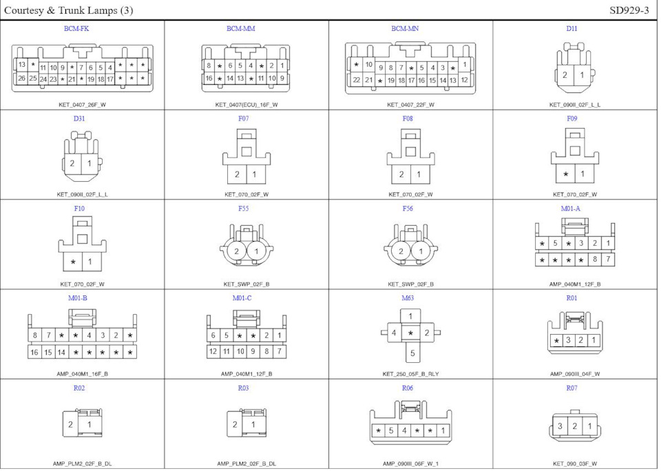 Дайте мне пожалуйста схему и распиновку разьема передних осветительных приборов: фары, светодиодная полоска и т.д. Kia Sorento 2013 год. Сборка Казахстан.