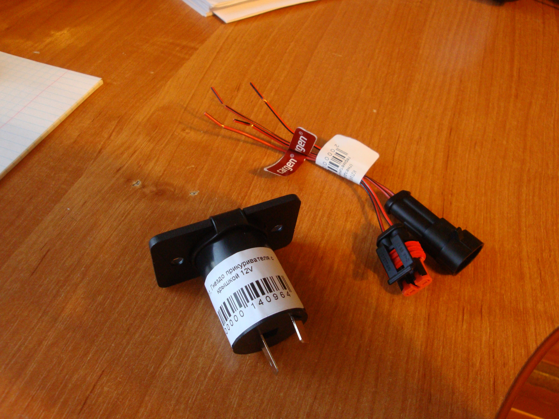 В автомагазине приобрёл самое обычное гнездо прикуривателя (78р) и пару произвольных небольших разъёмов на два контакта с фиксатором (папа-мама) (около 100р).