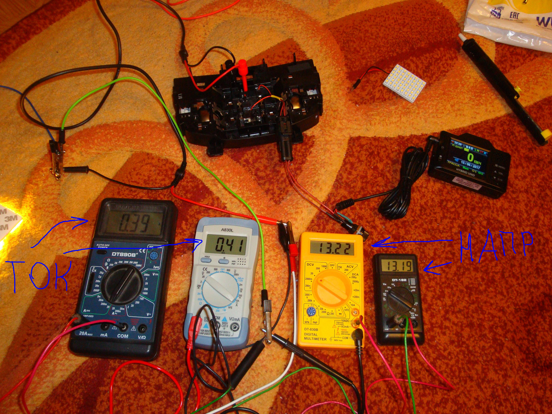 Далее проверка: к плафону подключил 12в от блока питания (БП не стабилизированный, поэтому не ровно 12в), контролируя напряжение питания и ток потребления: