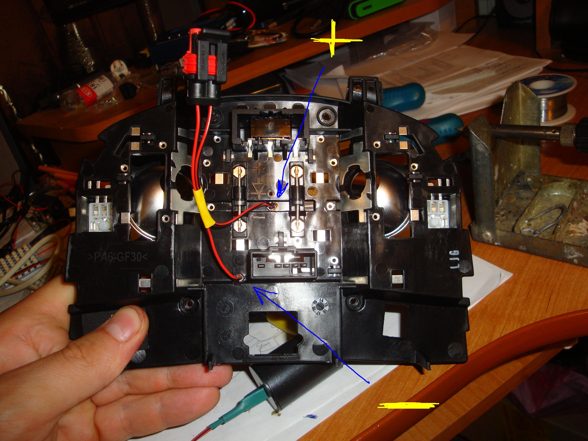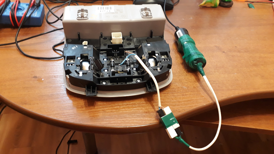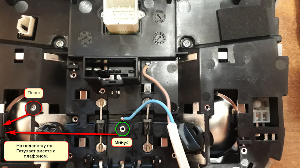 Далее нашел удобные точки + и — на плафоне с помощью мультиметра.
