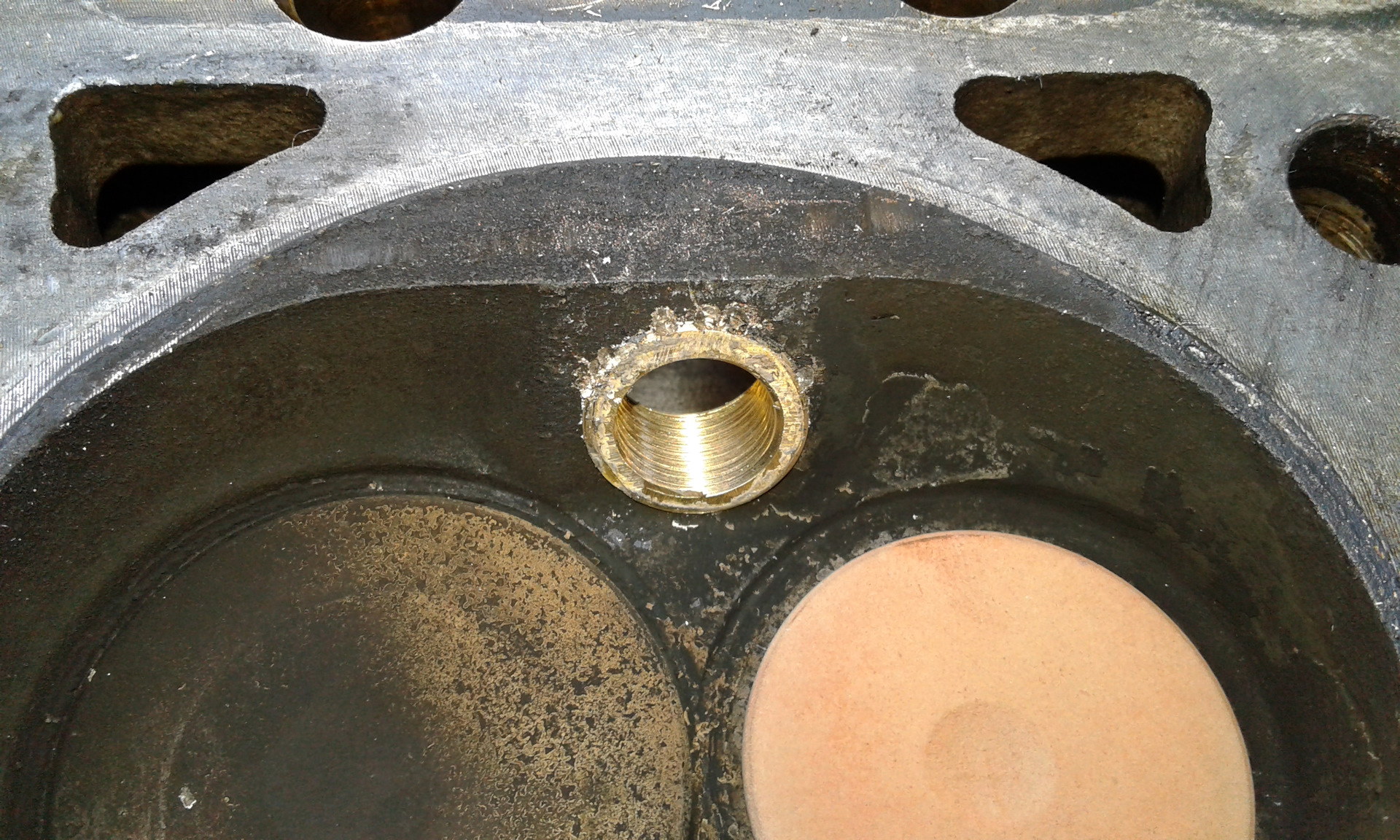 Во-вторых, надо было раскернить резьбу изнутри, иначе ввёртыш выворачивался вместе со свечой. Полагаться только на герметик в данной ситуации — неправильно.