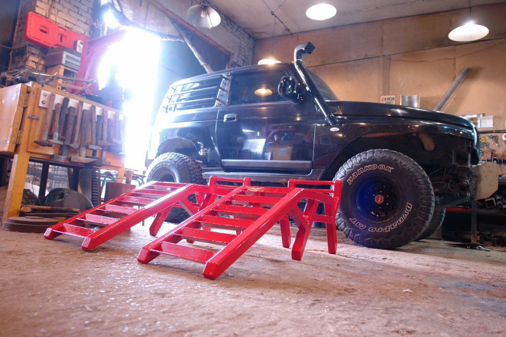 Я дома у себя так делаю, подьезжаю задними колесами впритык к таким эстакадкам, выхожу и подставляю такие же под передние сзади, газу и машина заскакивает.