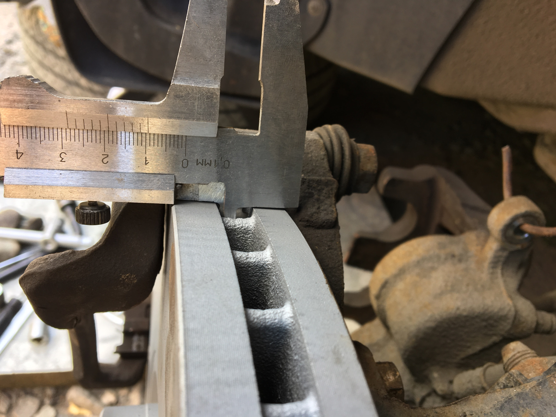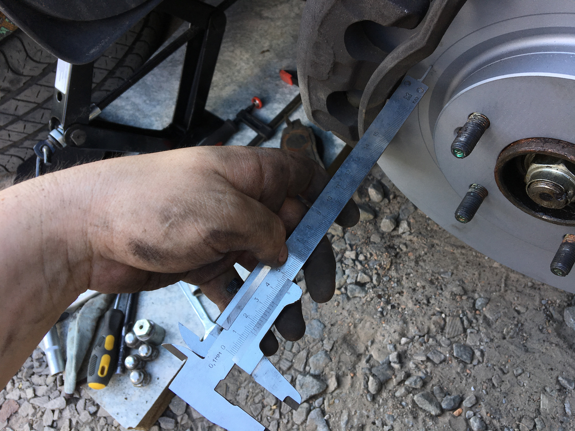 Сегодня менял передние колодки и сделал замеры. Замер делал от тормозного поршня. Приспособления для вдавливания тормозного поршня не было, полностью вдавить не получилось, но предварительные замеры показали что новые колодки (толщина 16 мм замерял свои) должны стать с диском 32 мм (в впритык но должны стать).