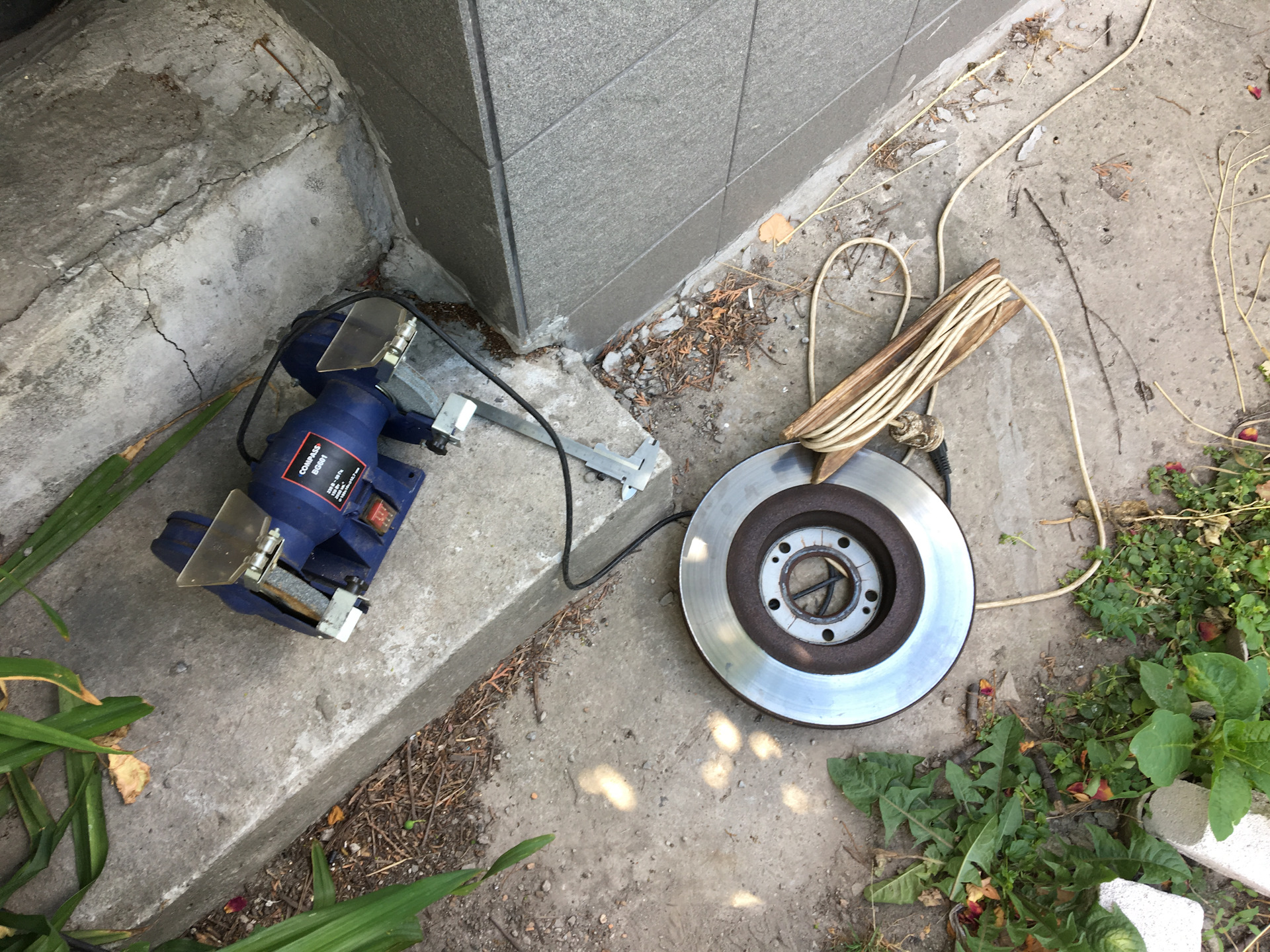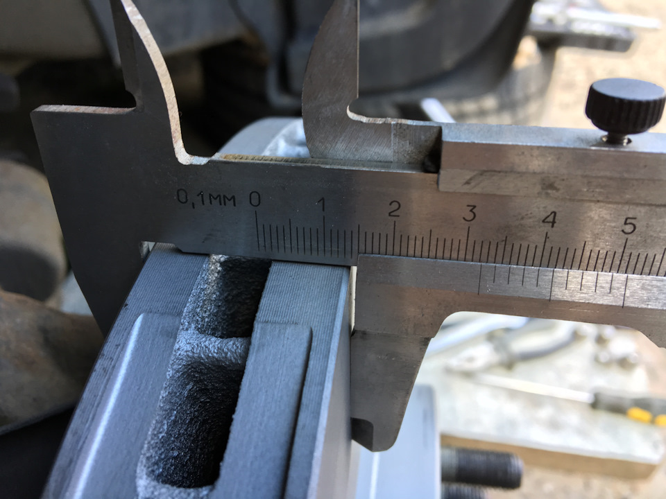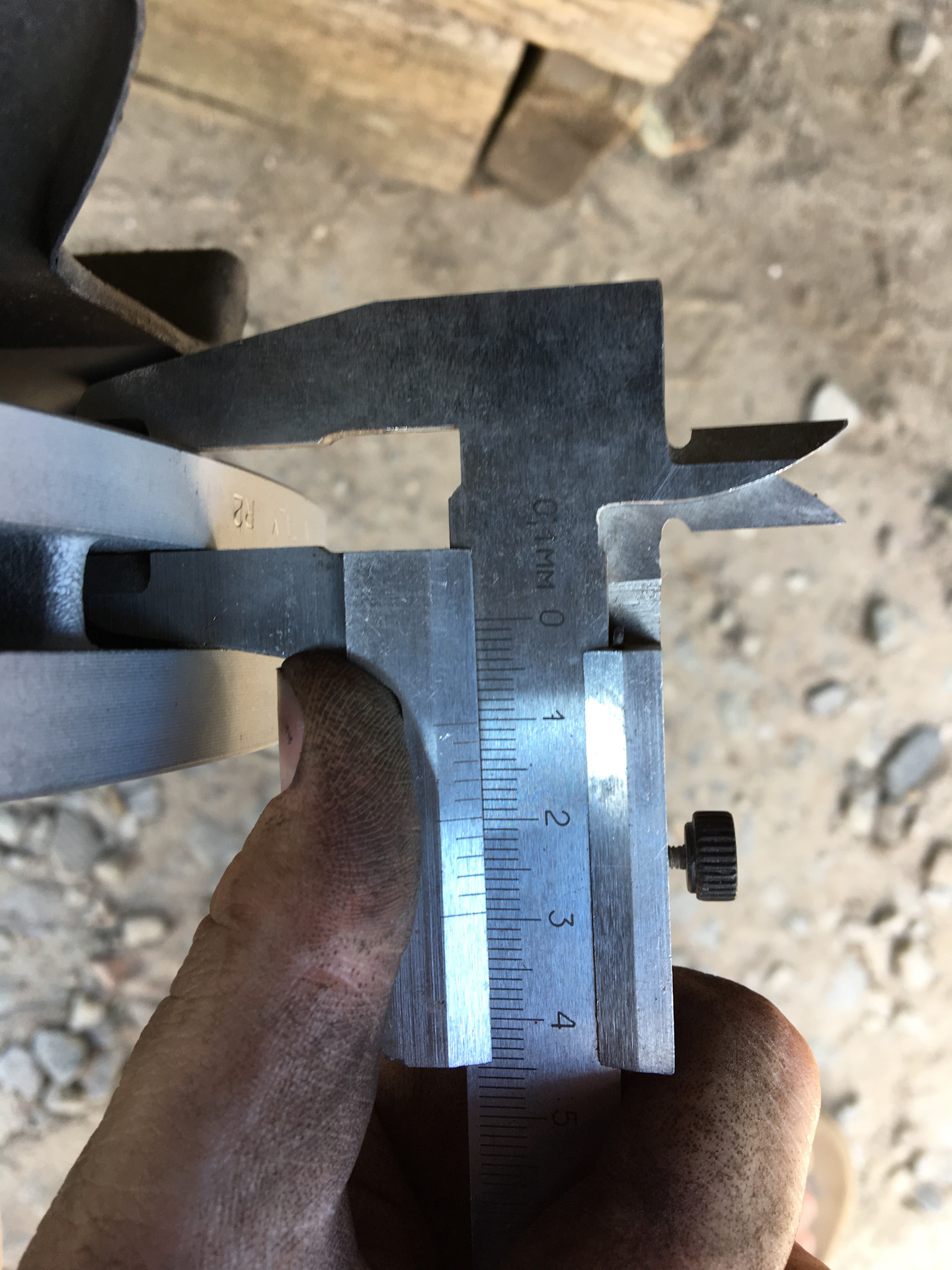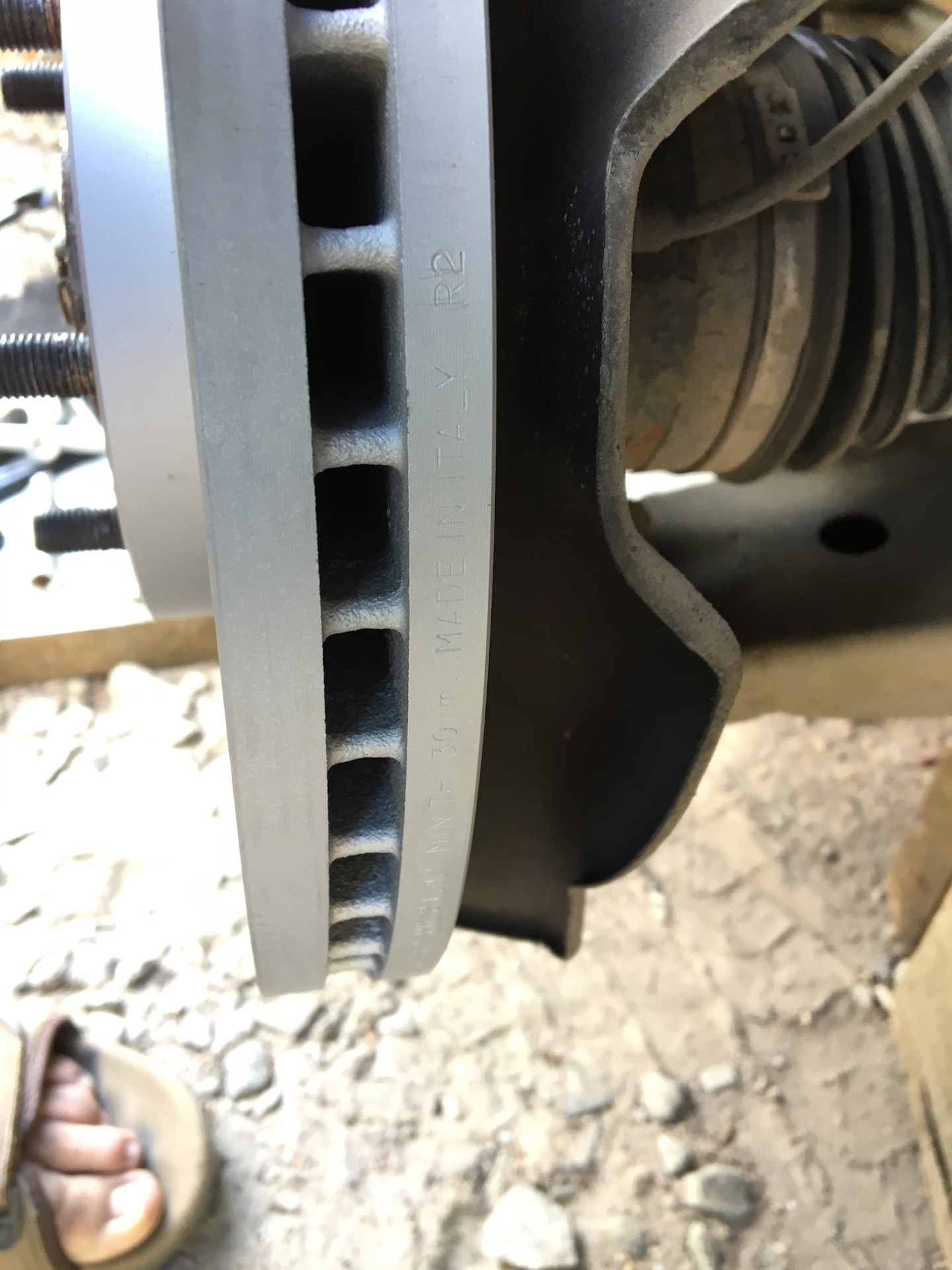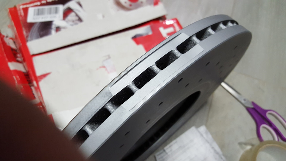 тут не сложно!скоба для суппорта дала прикурить! особенно верхний болт!из части соседского забора, пастижами, выгибаем подобие крючка, чтобы он удерживал суппорт, пока мы будем возиться с тормозным диском и скобой суппорта!больше всего я переживал, что диск прикипит к ступице, а оказалось, что выкрутив 2 винта, и слегка качнув диск сверху и снизу, он легко отлип от ступицы!далее нужно было произвести замер толщины старого диска, но бороздки с наружной и внутренней части мешали штангенциркулю прижаться к поверхностям диска!для устранения этого недоразумения свои услуги предложило точило, я не мог ему отказать!замер толщины диска показал цифру 26,4 мм (начальная толщина 28 мм) — и это за пробег 63000 км!красиво пишут!вроде бы сел неплохо!толщина диска 32 мм!вроде бы даже италия!небольшой зазорчик ещё есть!и тут!а вот эту информацию я найти нигде не смог! ширина воздушной прослойки!толщина наружного блина!и толщина внутреннего блина!