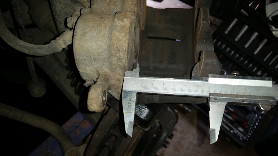 далее я выставил на штангенциркуле 15мм (именно такую толщину пишут производители колодок для kia sorento) и промерял с обеих сторон!