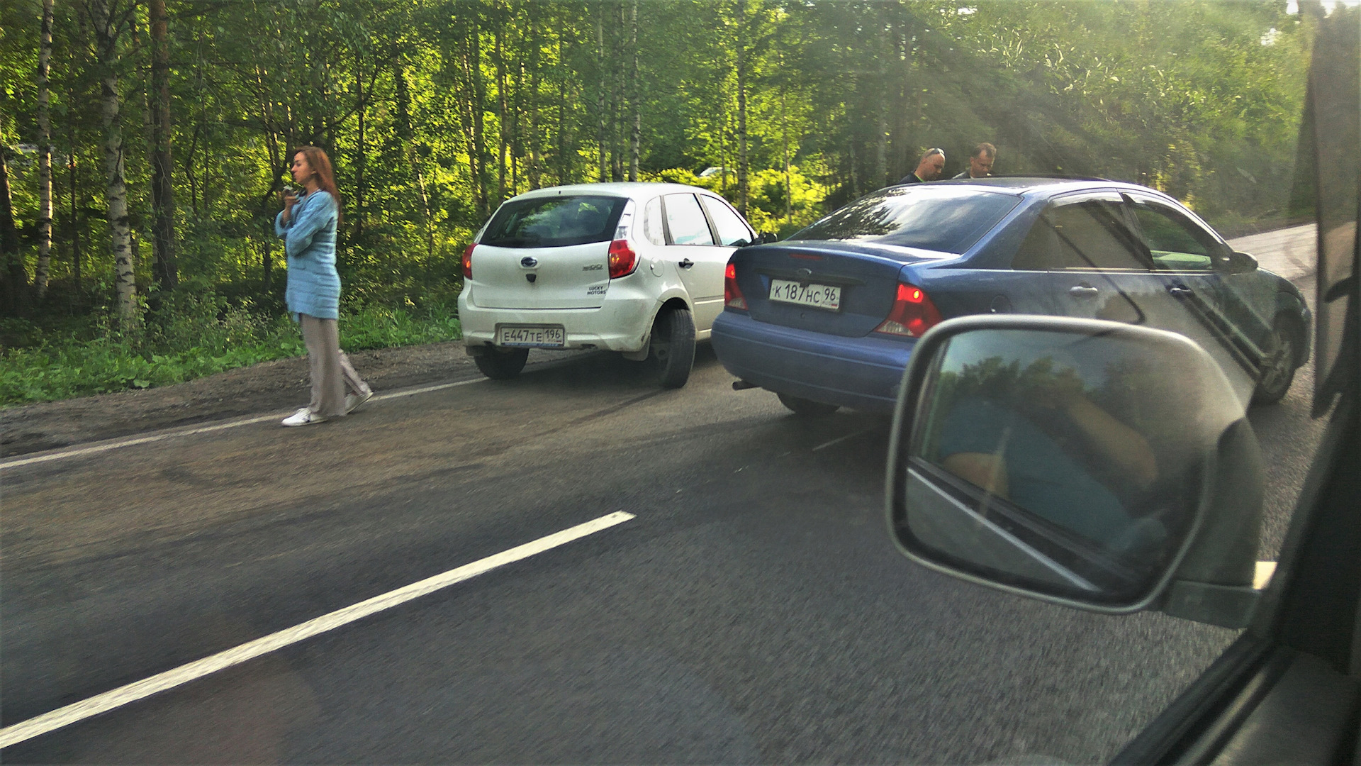 Все, мчим, значит, обратно. На трассе встретили странное ДТП. Я так понял, у Датсуна на ходу колесо отвалилось 0_о
